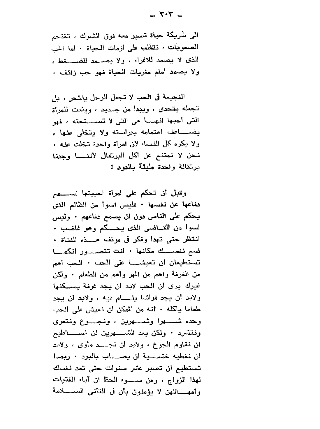وقبل أن تحكم على امرأة أحببتها اسمع دفاعها عن نفسها. فليس أسوأ من الظالم الذي يحكم على الناس دون أن يسمع دفاعهم. وليس أسوأ من القاضي الذي يحكم وهو غاضب. انتظر حتى تهدأ، وفكر في موقف هذه الفتاة. ضع نفسك مكانها. أنت تتصور أنكما تستطيعان أن تعيشا على الحب. الحب أهم من الغرفة وأهم من المهر وأهم من الطعام. ولكن غيرك يرى أن الحب لا بد أن يجد غرفة يسكنها، ولا بد أن يجد فراشًا ينام فيه، ولا بد أن يجد طعامًا يأكله. إنه من الممكن أن نعيش على الحب وحده شهرًا وشهرين، ونجوع ونتعرى ونتشرد. ولكن بعد الشهرين لن نستطيع أن نقاوم الجوع، ولا بد أن نجد مأوى، ولا بد أن نغطيه خشية أن يصاب بالبرد. ربما تستطيع أن تصبر عشر سنوات حتى تعد نفسك لهذا الزواج، ومن سوء الحظ أن آباء الفتيات وأمهاتهن لا يؤمنون بأن في التأني السلامة
