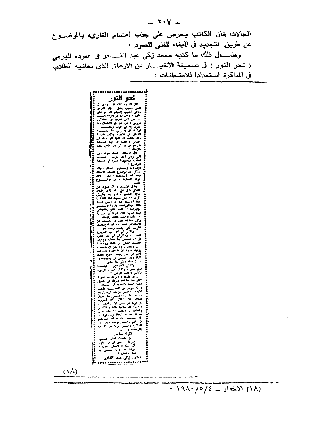 ومثال ذلك ما كتبه محمد زكي عبد القادر في عموده اليومي "نحو النور" في صحيفة الأخبار عن الإرهاق الذي يعانيه الطلاب في المذاكرة استعدادًا للامتحانات:
