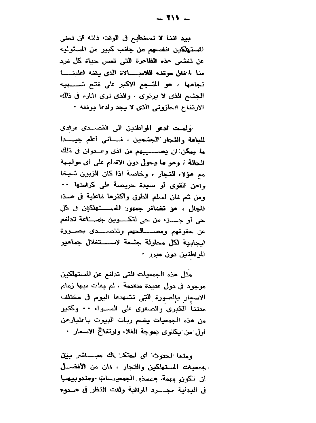 ولست أدعو المواطنين إلى التصدي فرادى للباعة والتجار الجشعين، فإني أعلم جيدًا ما يمكن أن يصيبهم من أذى وعدوان في تلك الحالة، وهو ما يحول دون الإقدام على أي مواجهة مع هؤلاء التجار، وخاصة إذا كان الزبون واهن القوى أو سيدة حريصة على كرامتها.. ومن ثم فإن أسلم الطرق وأكثرها فاعلية في هذا المجال، هو تضافر جمهور المستهلكين في كل حي أو جزء من حي لتكوين جماعة تدافع عن حقوقهم ومصالحهم، وتتصدى بصورة إيجابية لكل محاولة جشعة لاستغلال جماهير المواطنين دون مبرر.