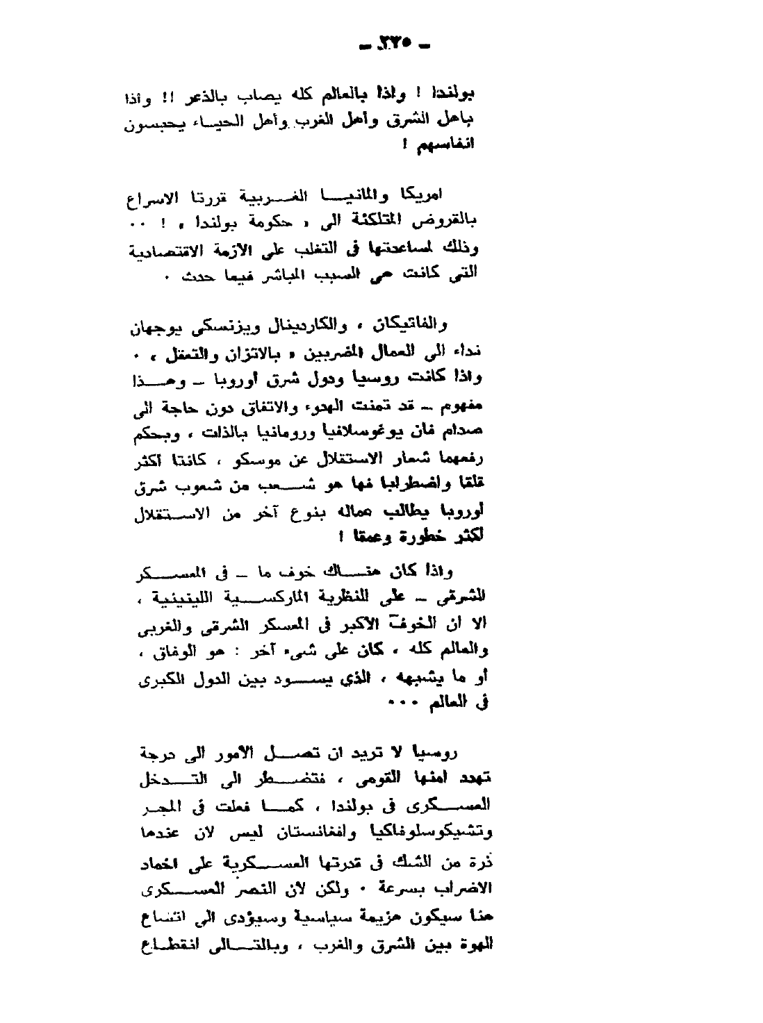 روسيا لا تريد أن تصل الأمور إلى درجة تهدد أمنها القومي، فتضطر إلى التدخل العسكري في بولندا، كما فعلت في المجر وتشيكوسلوفاكيا وأفغانستان، ليس لأن عندها ذرة من الشك في قدرتها العسكرية على إخماد الإضراب بسرعة؛ ولكن لأن النصر العسكري هنا سيكون هزيمة سياسية، وسيؤدي إلى اتساع الهوة بين الشرق والغرب، وبالتالي انقطاع