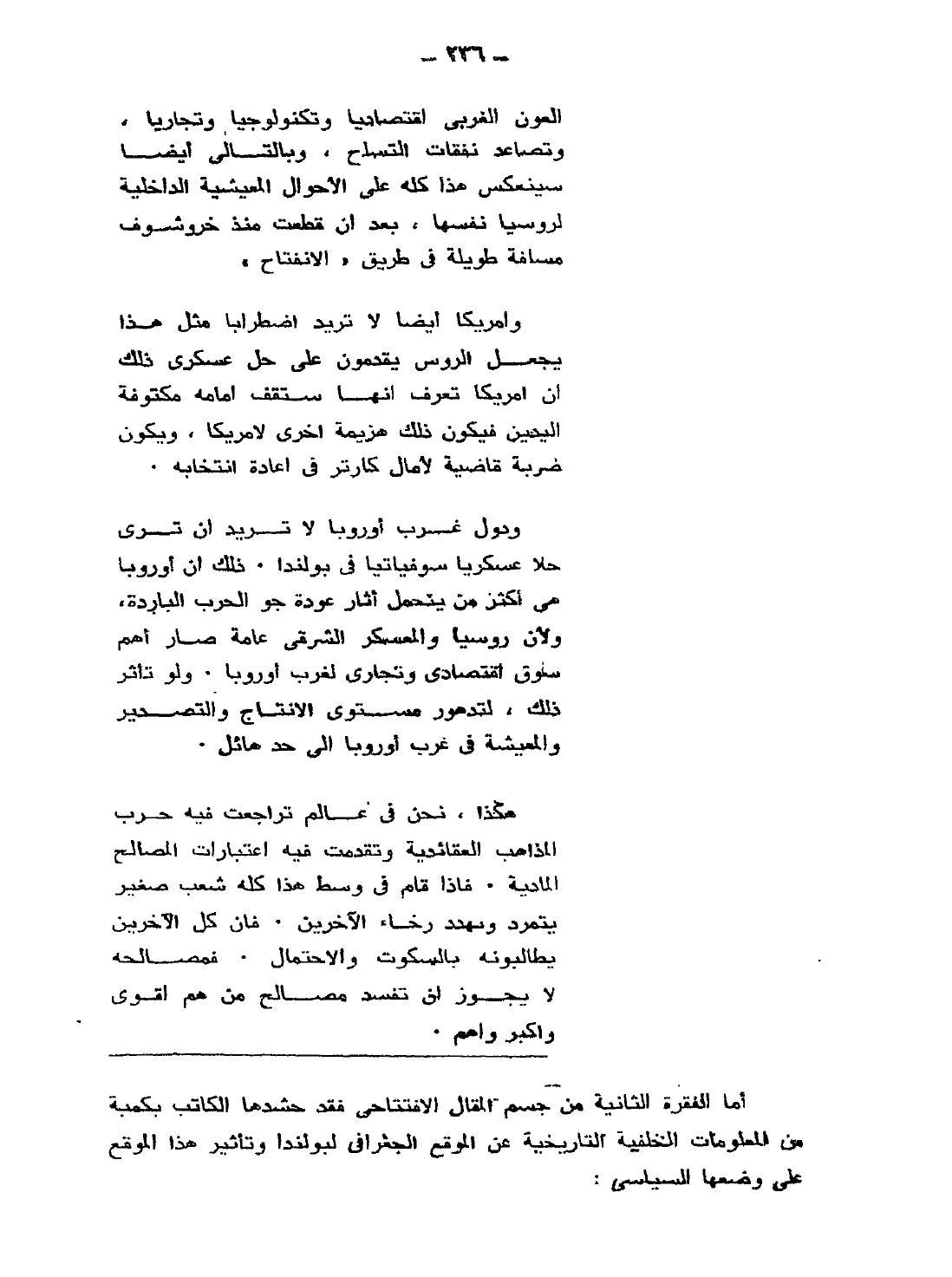 أما الفقرة الثانية من جسم المقال الافتتاحي، فقد حشدها الكاتب بكمية من المعلومات الخلفية التاريخية عن الموقع الجغرافي لبولندا، وتأثير هذا الموقع على وضعها السياسي: