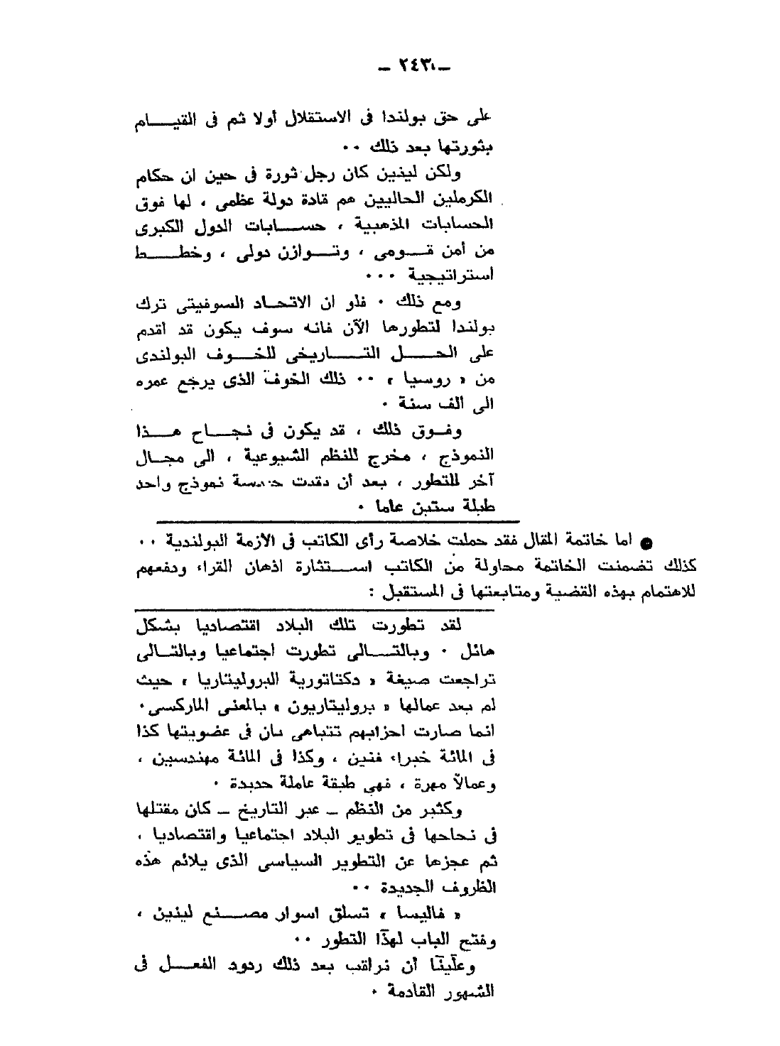 - أما خاتمة المقال فقد حملت خلاصة رأي الكاتب في الأزمة البولندية.. كذلك تضمنت الخاتمة محاولة من الكاتب لاستثارة أذهان القراء ودفعهم للاهتمام بهذه القضية ومتابعتها في المستقبل: