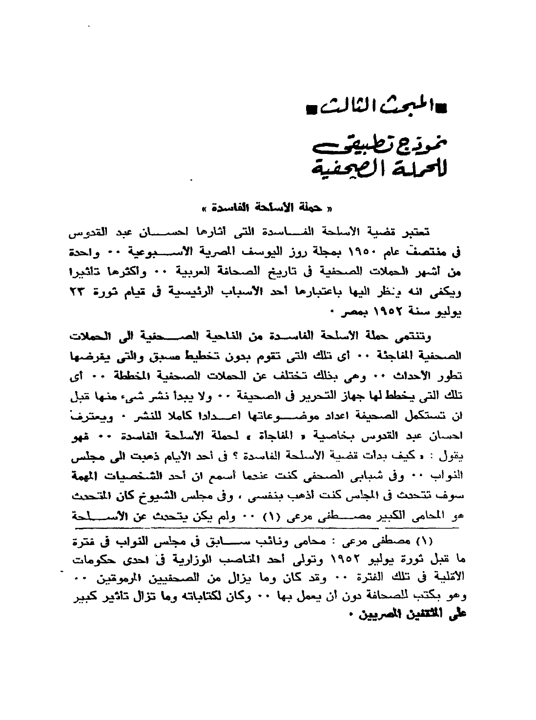1 مصطفى مرعي: محام ونائب سابق في مجلس النواب في فترة ما قبل ثورة يوليو 1952، وتولى أحد المناصب الوزارية في إحدى حكومات الأقلية في تلك الفترة.. وقد كان وما يزال من الصحفيين المرموقين.. وهو يكتب للصحافة دون أن يعمل بها.. وكان لكتاباته وما تزال تأثير كبير على المثقفين المصريين.