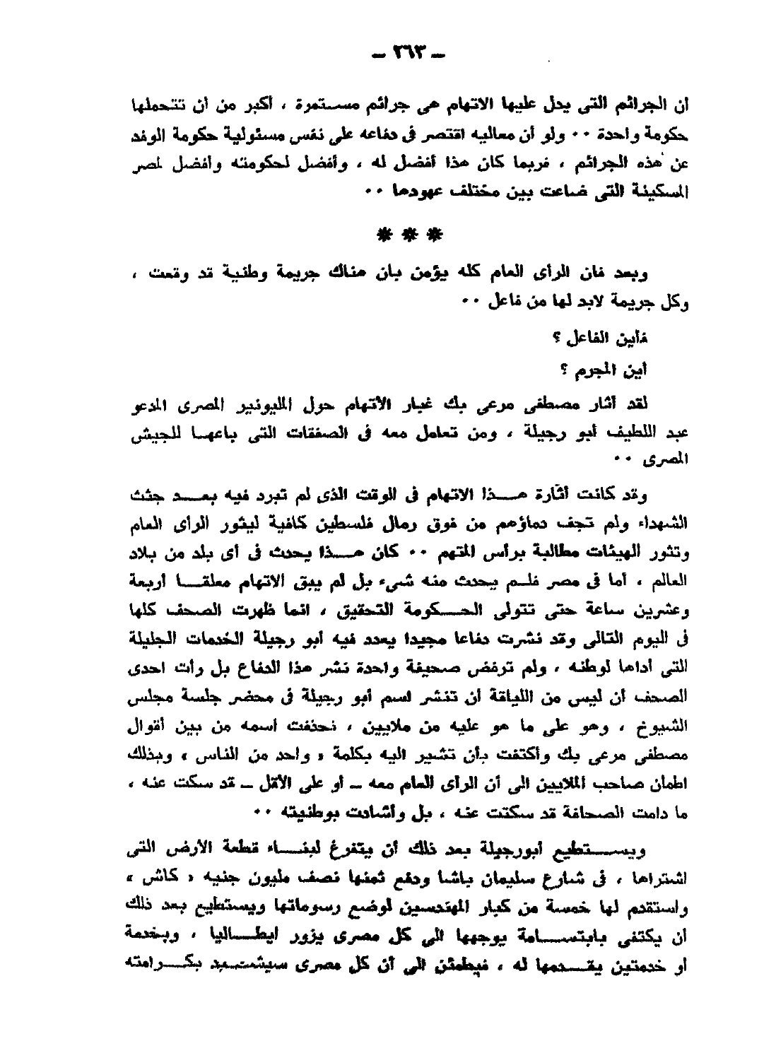 أن الجرائم التي يدل عليها الاتهام هي جرائم مستمرة، أكبر من أن تتحملها حكومة واحدة.. ولو أن معاليه اقتصر في دفاعه على نفس مسئولية حكومة الوفد عن هذه الجرائم، فربما كان هذا أفضل له، وأفضل لحكومته، وأفضل لمصر المسكينة التي ضاعت بين مختلف عهودها..