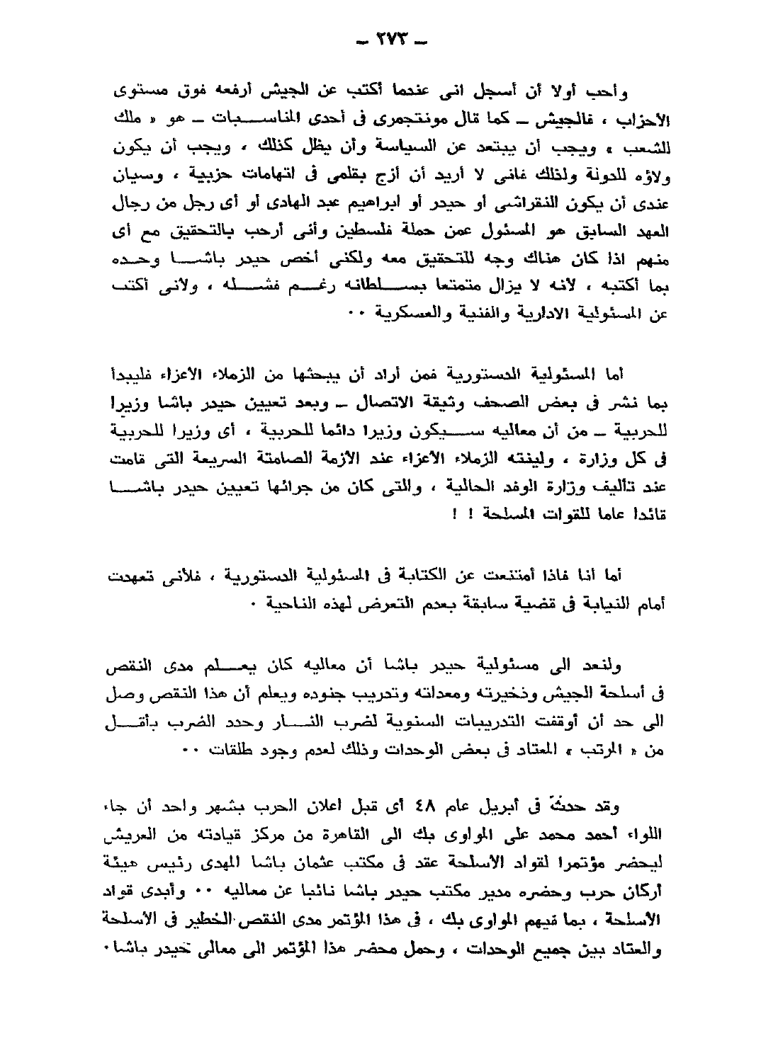 وأحب أولًا أن أسجل أني عندما أكتب عن الجيش أرفعه فوق مستوى الأحزاب، فالجيش -كما قال مونتجمري في إحدى المناسبات- هو "ملك الشعب"، ويجب أن يبتعد عن السياسة وأن يظل كذلك، ويجب أن يكون ولاؤه للدولة؛ ولذلك فإني لا أريد أن أزج بقلمي في اتهامات حزبية، وسيان عندي أن يكون النقراشي أو حيدر أو إبراهيم عبد الهادي أو أي رجل من رجال العهد السابق هو المسئول عن حملة فلسطين، وإني أرحب بالتحقيق مع أي منهم إذا كان هناك وجه للتحقيق معه؛ ولكني أخص حيدر باشا وحده بما أكتبه؛ لأنه لا يزال متمتعًا بسلطانه رغم فشله، ولأني أكتب عن المسئولية الإدارية والفنية والعسكرية..