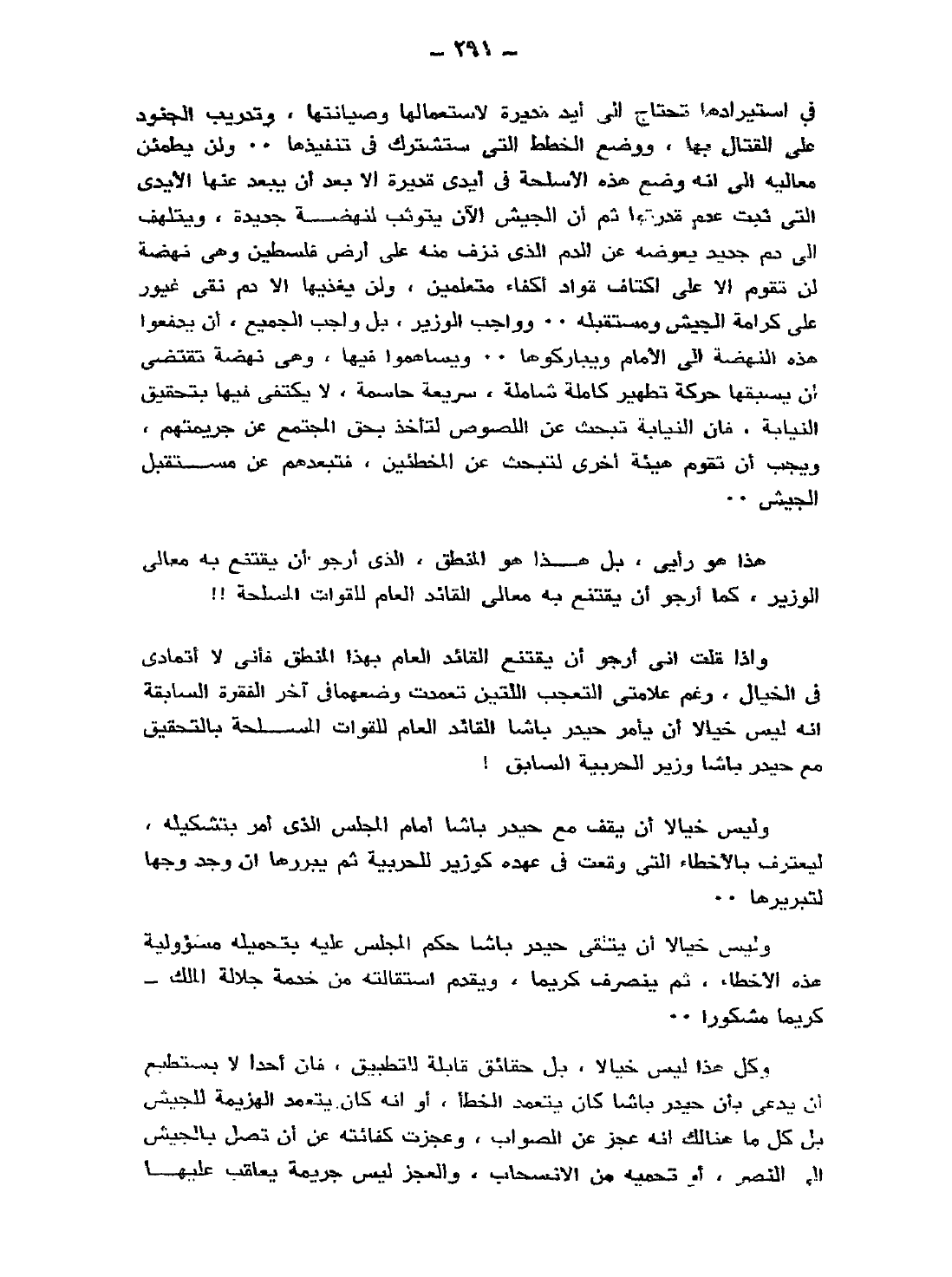 في استيرادها، تحتاج إلى أيد قديرة لاستعمالها وصيانتها، وتدريب الجنود على القتال بها، ووضع الخطط التي ستشترك في تنفيذها.. ولن يطمئن معاليه إلى أنه وضع هذه الأسلحة في أيدي قديرة إلا بعد أن يبعد عنها الأيدي التي ثبت عدم قدرتها، ثم إن الجيش الآن يتوثب لنهضة جديدة، ويتلهف إلى دم جديد يعوضه عن الدم الذي نزف منه على أرض فلسطين، وهي نهضة لن تقوم إلا على أكتاف قواد أَكْفَاء متعلمين، ولن يغذيها إلا دم نقي غيور على كرامة الجيش ومستقبله.. وواجب الوزير، بل واجب الجميع، أن يدفعوا هذه النهضة إلى الأمام ويباركوها.. ويساهموا فيها، وهي نهضة تقتضي أن يسبقها حركة تطهير كاملة شاملة، سريعة حاسمة، لا يكتفى فيها بتحقيق النيابة، فإن النيابة تبحث عن اللصوص لتأخذ بحق المجتمع عن جريمتهم، ويجب أن تقوم هيئة أخرى لتبحث عن المخطئين، فتبعدهم عن مستقبل الجيش..