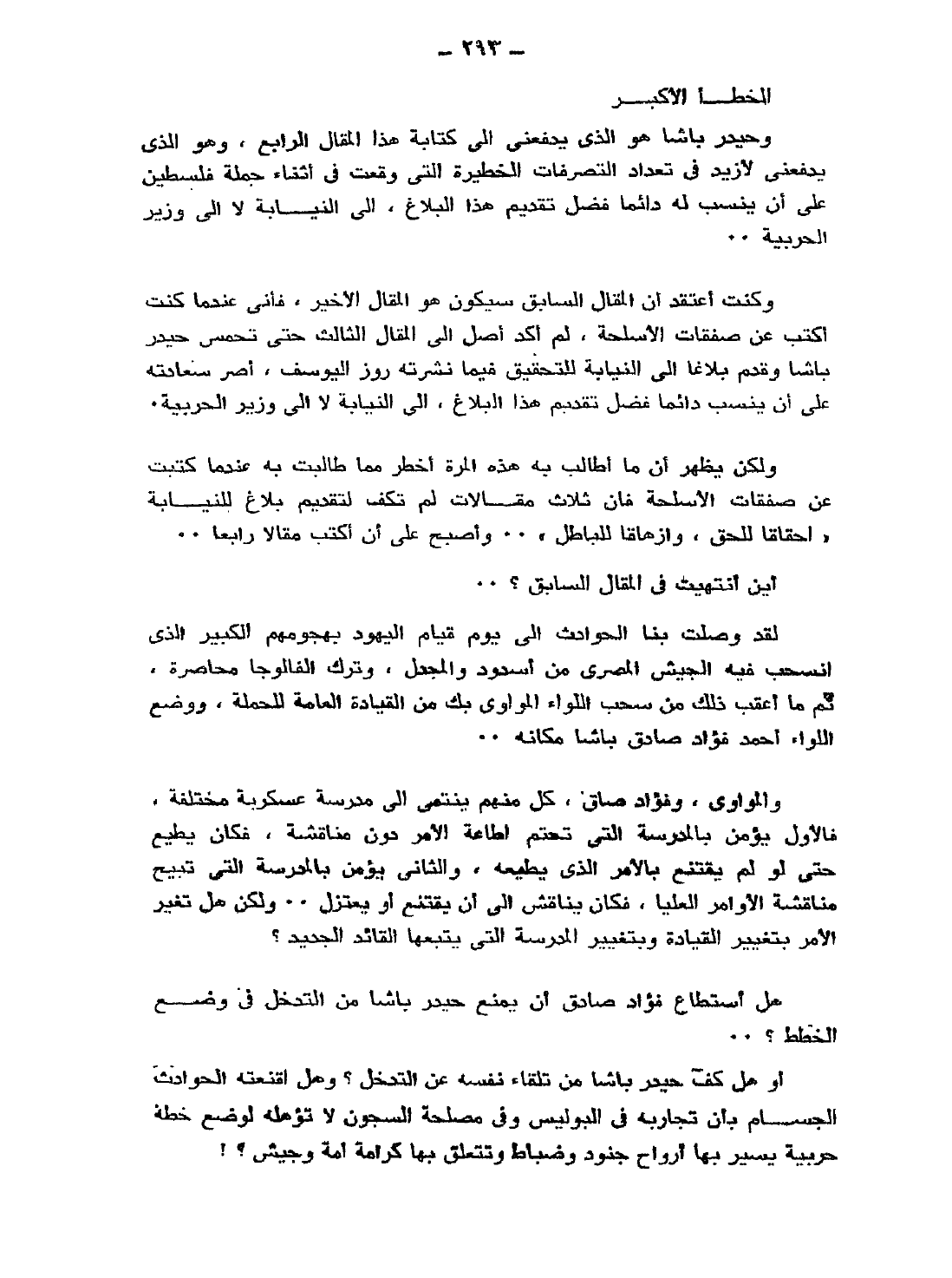 وحيدر باشا هو الذي يدفعني إلى كتابة هذا المقال الرابع، وهو الذي يدفعني لأزيد في تعداد التصرفات الخطيرة التي وقعت في أثناء حملة فلسطين، على أن ينسب له دائمًا فضل تقديم هذا البلاغ إلى النيابة لا إلى وزير الحربية..