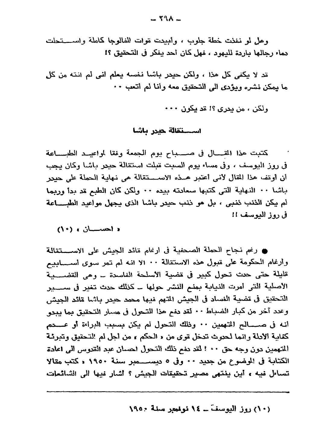 كتبت هذا المقال في صباح يوم الجمعة وفقًا لمواعيد الطباعة في روزاليوسف، وفي مساء يوم السبت قبلت استقالة حيدر باشا، وكان يجب أن أوقف هذا المقال لأني أعتبر هذه الاستقالة هي نهاية الحملة على حيدر باشا.. النهاية التي كتبها سعادته بيده.. ولكن كان الطبع قد بدأ وربما لم يكن الذنب ذنبي؛ بل هو ذنب حيدر باشا الذي يجهل مواعيد الطباعة في روزاليوسف!!
