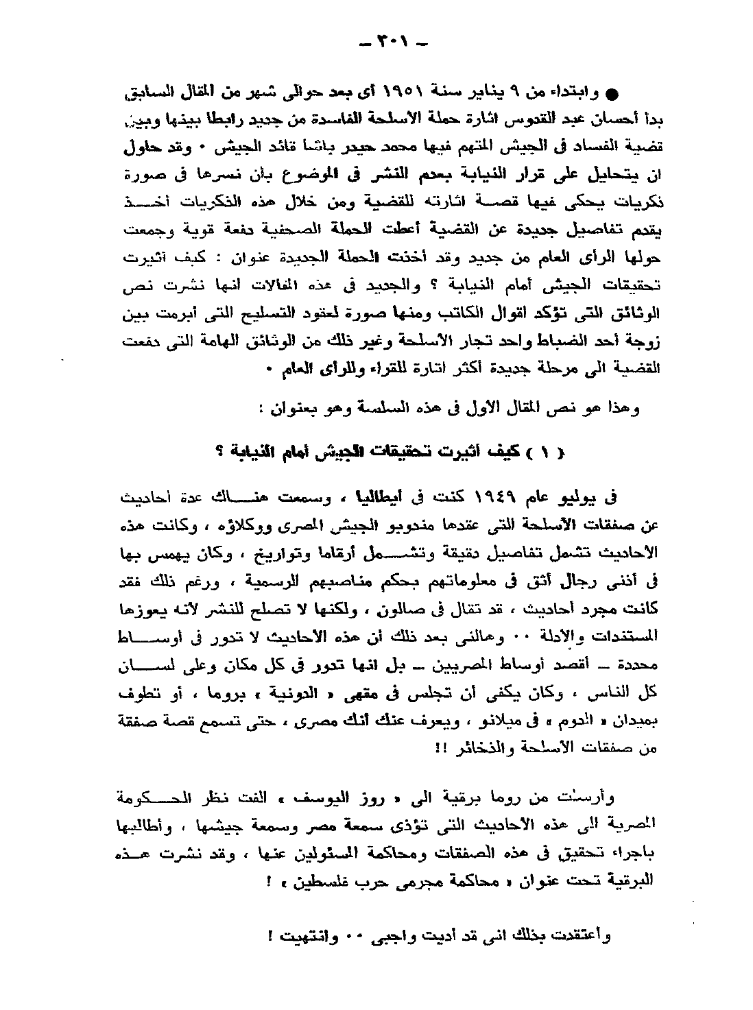 في يوليو عام 1949 كنت في إيطاليا، وسمعت هناك عدة أحاديث عن صفقات الأسلحة التي عقدها مندبو الجيش المصري ووكلاؤه، وكانت هذه الأحاديث تشمل تفاصيل دقيقة، وتشمل أرقامًا وتواريخ، وكان يهمس بها في أذني رجال أثق في معلوماتهم بحكم مناصبهم الرسمية، ورغم ذلك فقد كانت مجرد أحاديث، قد تقال في صالون؛ ولكنها لا تصلح للنشر؛ لأنه يعوزها المستندات والأدلة. وهالني بعد ذلك أن هذه الأحاديث لا تدور في أوساط محددة -أقصد أوساط المصريين- بل إنها تدور في كل مكان وعلى لسان كل الناس، وكان يكفي أن تجلس في مقهى "الدونية" بروما، أو تطوف بميدان "الدوم" في ميلانو، ويُعرف عنك أنك مصري؛ حتى تسمع قصة صفقة من صفقات الأسلحة والذخائر!!
