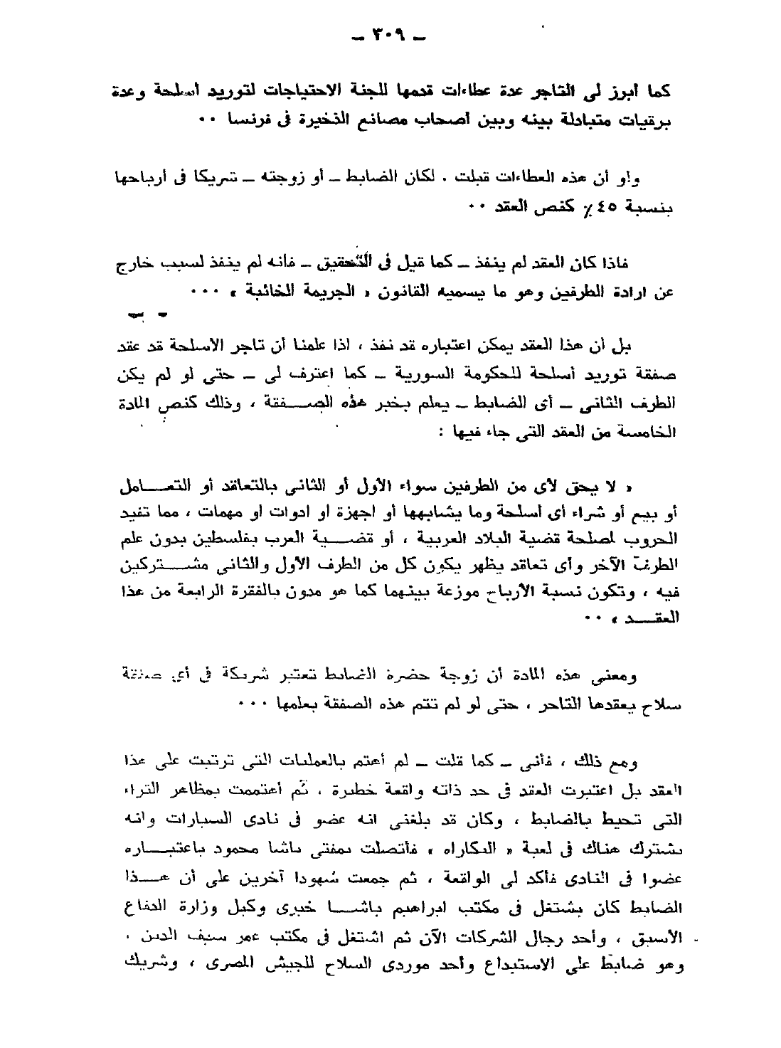 ومع ذلك، فإني -كما قلت- لم أهتم بالعمليات التي ترتبت على هذا العقد؛ بل اعتبرت العقد في حد ذاته واقعة خطيرة، ثم اهتممت بمظاهر الثراء التي تحيط بالضابط، وكان قد بلغني أنه عضو في نادي السيارات، وأنه يشترك هناك في لعبة "البكاراه" فاتصلت بمفتي باشا محمود باعتباره عضوًا في النادي فأكد لي الواقعة، ثم جمع شهودًا آخرين على أن هذا الضابط كان يشتغل في مكتب إبراهيم باشا خيري وكيل وزارة الدفاع الأسبق، وأحد رجال الشركات الآن، ثم اشتغل في مكتب عمر سيف الدين، وهو ضابط على الاستبداع وأحد موردي السلاح للجيش المصري، وشريك