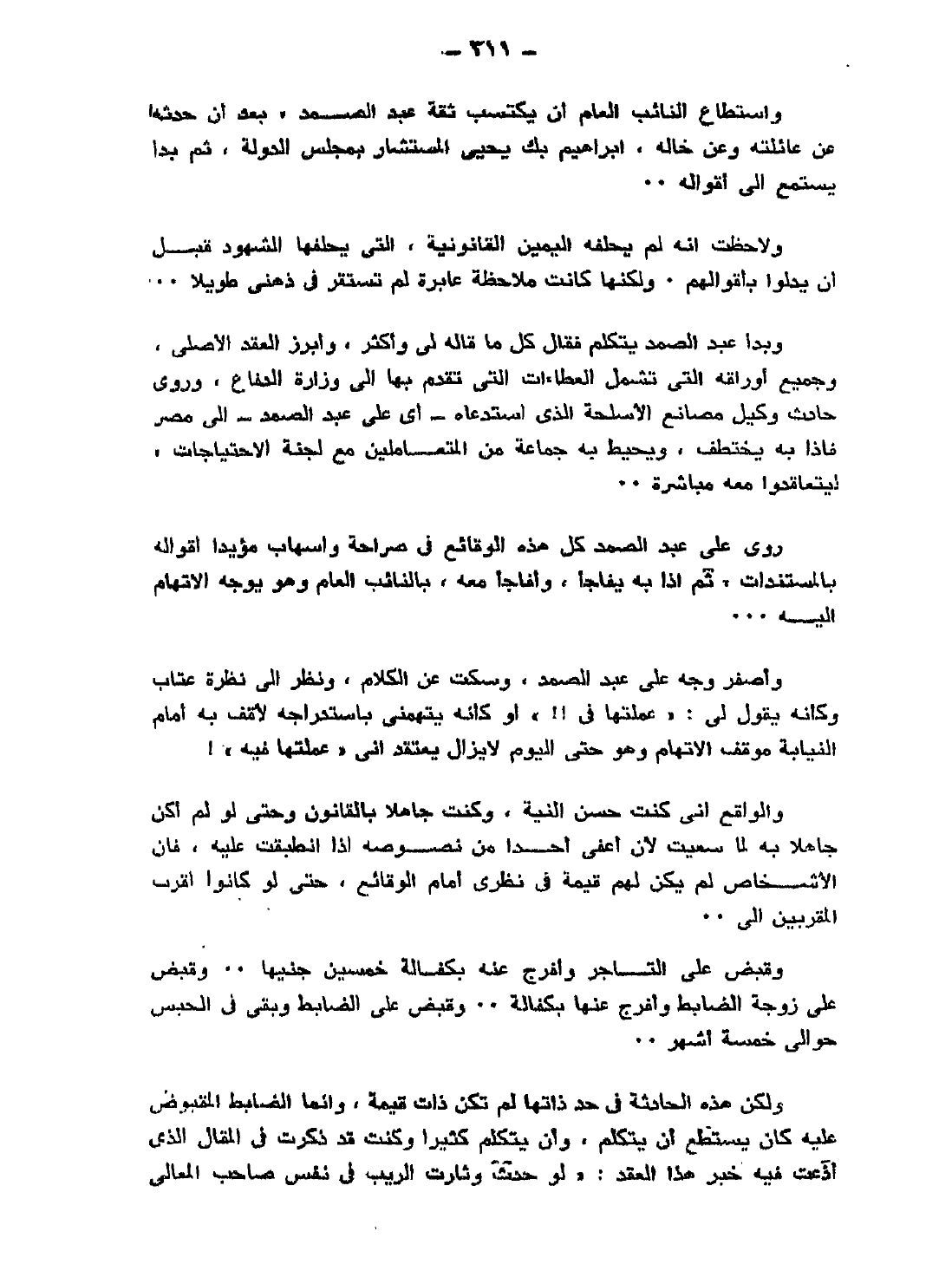 وبدأ عبد الصمد يتكلم فقال كل ما قاله لي وأكثر، وأبرز العقد الأصلي، وجميع أوراقه التي تشمل العطاءات التي تقدم بها إلى وزارة الدفاع، وروى حادث وكيل مصانع الأسلحة الذي استدعاه -أي: علي عبد الصمد- إلى مصر فإذا به يختطف، ويحيط به جماعة من المتعاملين مع لجنة الاحتياجات؛ ليتعاقدوا معه مباشرة.