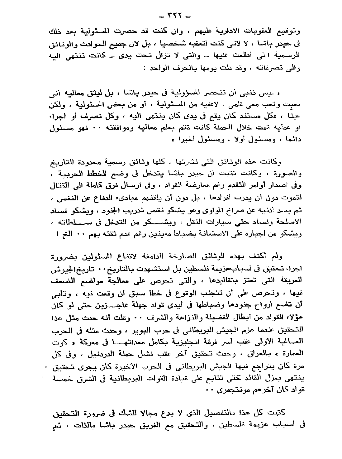 كتبت كل هذا بالتفصيل الذي لا يدع مجالًا للشك في ضرورة التحقيق في أسباب هزيمة فلسطين، والتحقيق مع الفريق حيدر باشا بالذات، ثم