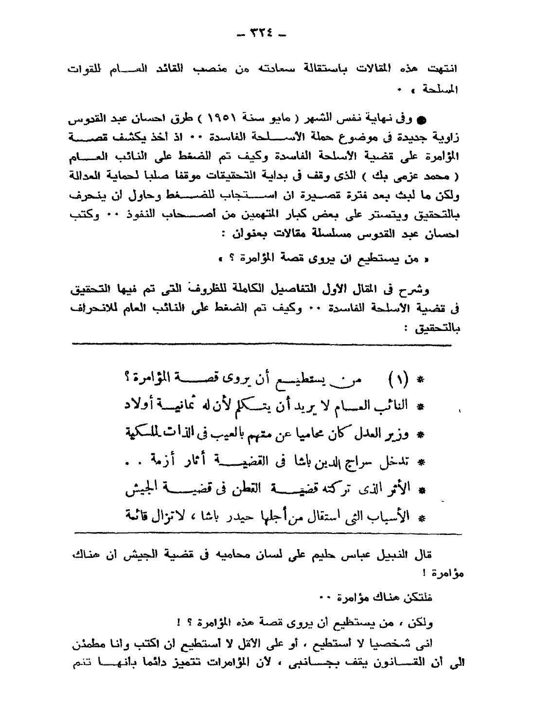 - وفي نهاية نفس الشهر "مايو سنة 1951" طرق إحسان عبد القدوس زاوية جديدة في موضوع حملة الأسلحة الفاسدة.. إذ أخذ يكشف قصة المؤامرة على قضية الأسلحة الفاسدة، وكيف تم الضغط على النائب العام "محمد عزمي بك" الذي وقف في بداية التحقيقات موقفًا صُلْبًا لحماية العدالة؛ ولكن ما لبث بعد فترة قصيرة أن استجاب للضغط، وحاول أن ينحرف بالتحقيق، ويتستر على بعض كبار المتهمين من أصحاب النفوذ.. وكتب إحسان عبد القدوس سلسلة مقالات بعنوان: