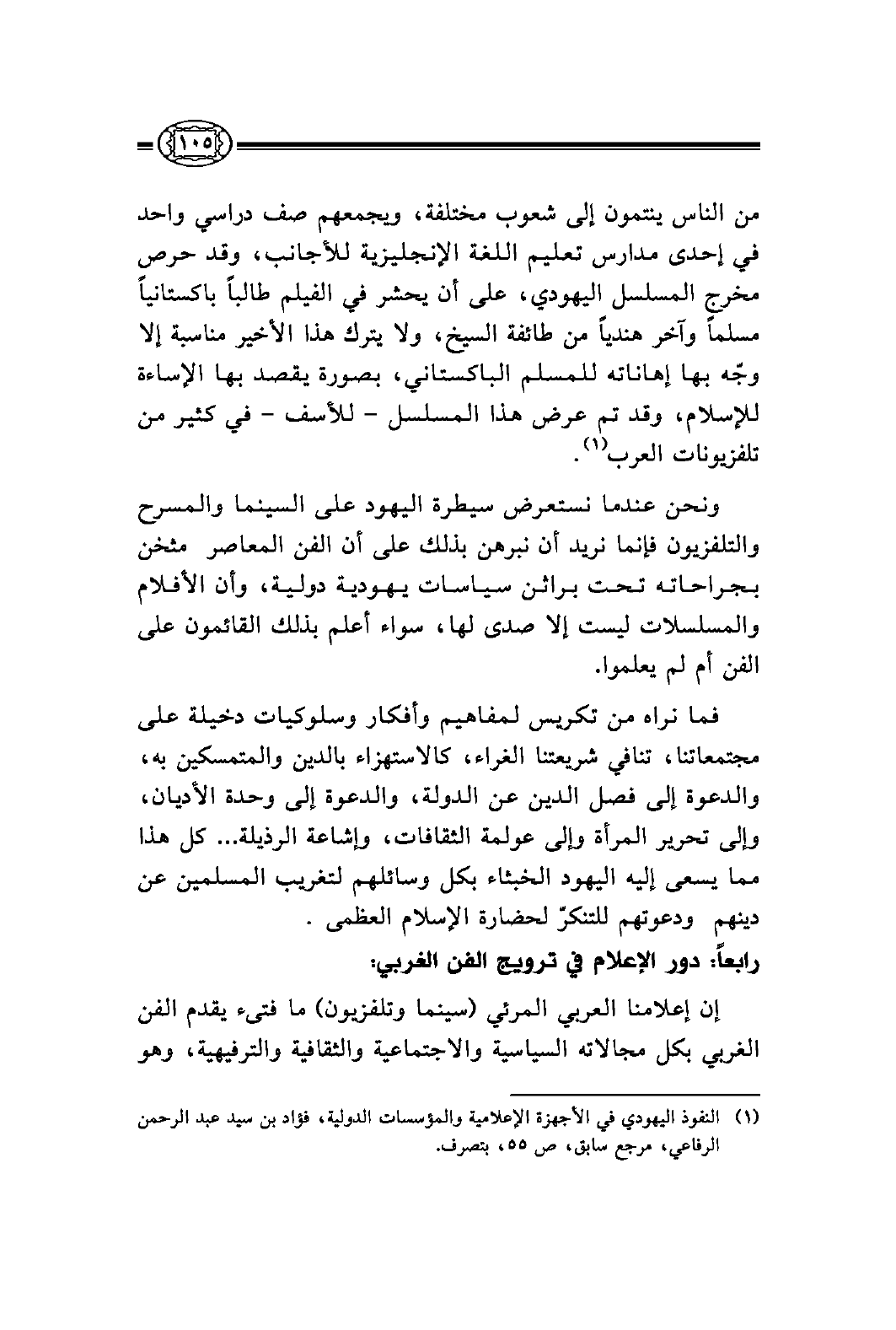 ونحن عندما نستعرض سيطرة اليهود على السينما والمسرح والتلفزيون فإنما نريد أن نبرهن بذلك على أن الفن المعاصر مثخن بجراحاته تحت براثن سياسات يهودية دولية، وأن الأفلام والمسلسلات ليست إلا صدى لها، سواء أعلم بذلك القائمون على الفن أم لم يعلموا.