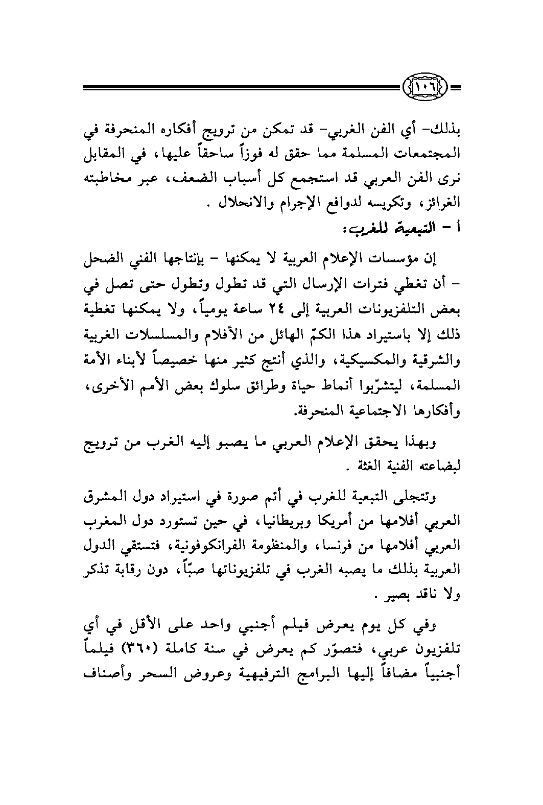 إن مؤسسات الإعلام العربية لا يمكنها - بإنتاجها الفني الضحل - أن تغطي فترات الإرسال التي قد تطول وتطول حتى تصل في بعض التلفزيونات العربية إلى 24 ساعة يومياً، ولا يمكنها تغطية ذلك إلا باستيراد هذا الكمّ الهائل من الأفلام والمسلسلات الغربية والشرقية والمكسيكية، والذي أنتج كثير منها خصيصاً لأبناء الأمة المسلمة، ليتشرّبوا أنماط حياة وطرائق سلوك بعض الأمم الأخرى، وأفكارها الاجتماعية المنحرفة.