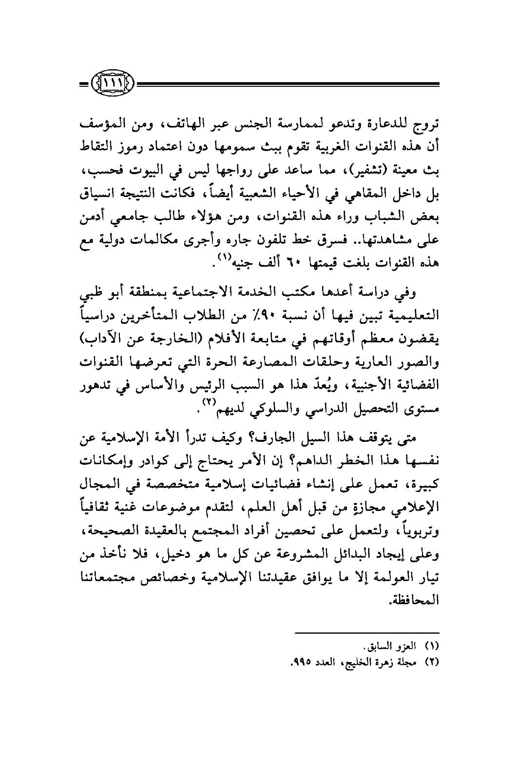 متى يتوقف هذا السيل الجارف؟ وكيف تدرأ الأمة الإسلامية عن نفسها هذا الخطر الداهم؟ إن الأمر يحتاج إلى كوادر وإمكانات كبيرة، تعمل على إنشاء فضائيات إسلامية متخصصة في المجال الإعلامي مجازةٍ من قبل أهل العلم، لتقدم موضوعات غنية ثقافياً وتربوياً، ولتعمل على تحصين أفراد المجتمع بالعقيدة الصحيحة، وعلى إيجاد البدائل المشروعة عن كل ما هو دخيل، فلا نأخذ من تيار العولمة إلا ما يوافق عقيدتنا الإسلامية وخصائص مجتمعاتنا المحافظة.