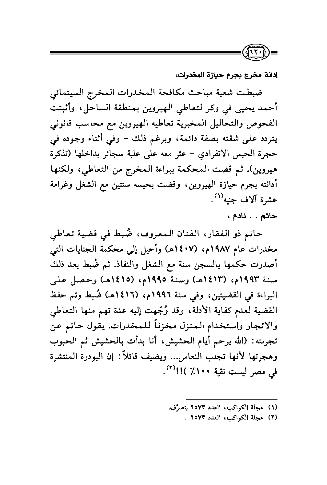 حاتم ذو الفقار، الفنان المعروف، ضُُبط في قضية تعاطي مخدرات عام 1987م، (1407هـ) وأحيل إلى محكمة الجنايات التي أصدرت حكمها بالسجن سنة مع الشغل والنفاذ. ثم ضُبط بعد ذلك سنة 1993م، (1413هـ) وسنة 1995م، (1415هـ) وحصل على البراءة في القضيتين، وفي سنة 1996م، (1416هـ) ضُبط وتم حفظ القضية لعدم كفاية الأدلة، وقد وُجّهت إليه عدة تهم منها التعاطي والاتجار واستخدام المنزل مخزناً للمخدرات. يقول حاتم عن تجربته: (الله يرحم أيام الحشيش، أنا بدأت بالحشيش ثم الحبوب وهجرتها لأنها تجلب النعاس ... ويضيف قائلاً: إن البودرة المنتشرة في مصر ليست نقية 100%) !! (¬2) .