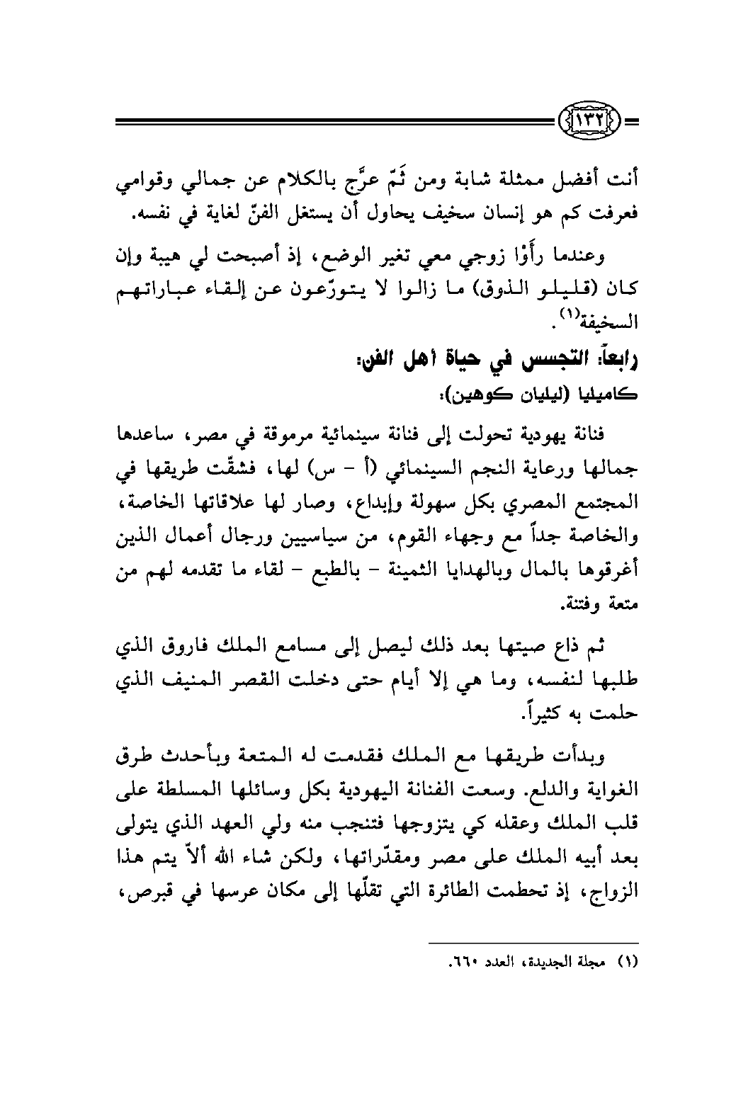 فنانة يهودية تحولت إلى فنانة سينمائية مرموقة في مصر، ساعدها جمالها ورعاية النجم السينمائي (أ - س) لها، فشقّت طريقها في المجتمع المصري بكل سهولة وإبداع، وصار لها علاقاتها الخاصة، والخاصة جداً مع وجهاء القوم، من سياسيين ورجال أعمال الذين أغرقوها بالمال وبالهدايا الثمينة - بالطبع - لقاء ما تقدمه لهم من متعة وفتنة.