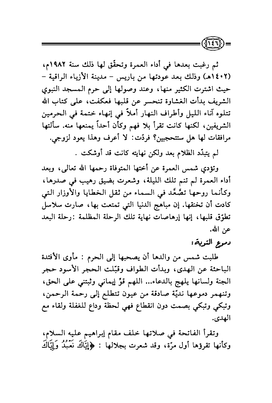 وتؤدي شمس العمرة عن أختها المتوفاة رحمها الله تعالى، وبعد أداء العمرة لم تنم تلك الليلة، وشعرت بضيق رهيب في صدرها، وكأنما روحها تصَّعَّد في السماء من ثقل الخطايا والأوزار التي كادت أن تخنقها. إن مباهج الدنيا التي تمتعت بها، صارت سلاسل تطوّق قلبها، إنها إرهاصات نهاية تلك الرحلة المظلمة: رحلة البعد عن الله.