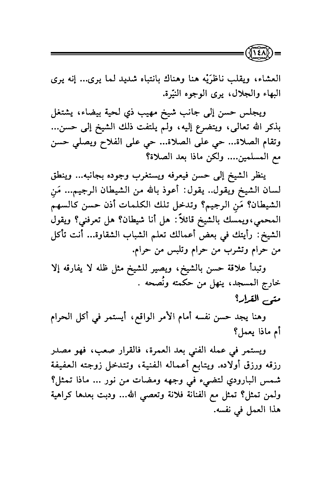 ويجلس حسن إلى جانب شيخ مهيب ذي لحية بيضاء، يشتغل بذكر الله تعالى، ويتضرع إليه، ولم يلتفت ذلك الشيخ إلى حسن ... وتقام الصلاة ... حي على الصلاة ... حي على الفلاح ويصلي حسن مع المسلمين.... ولكن ماذا بعد الصلاة؟