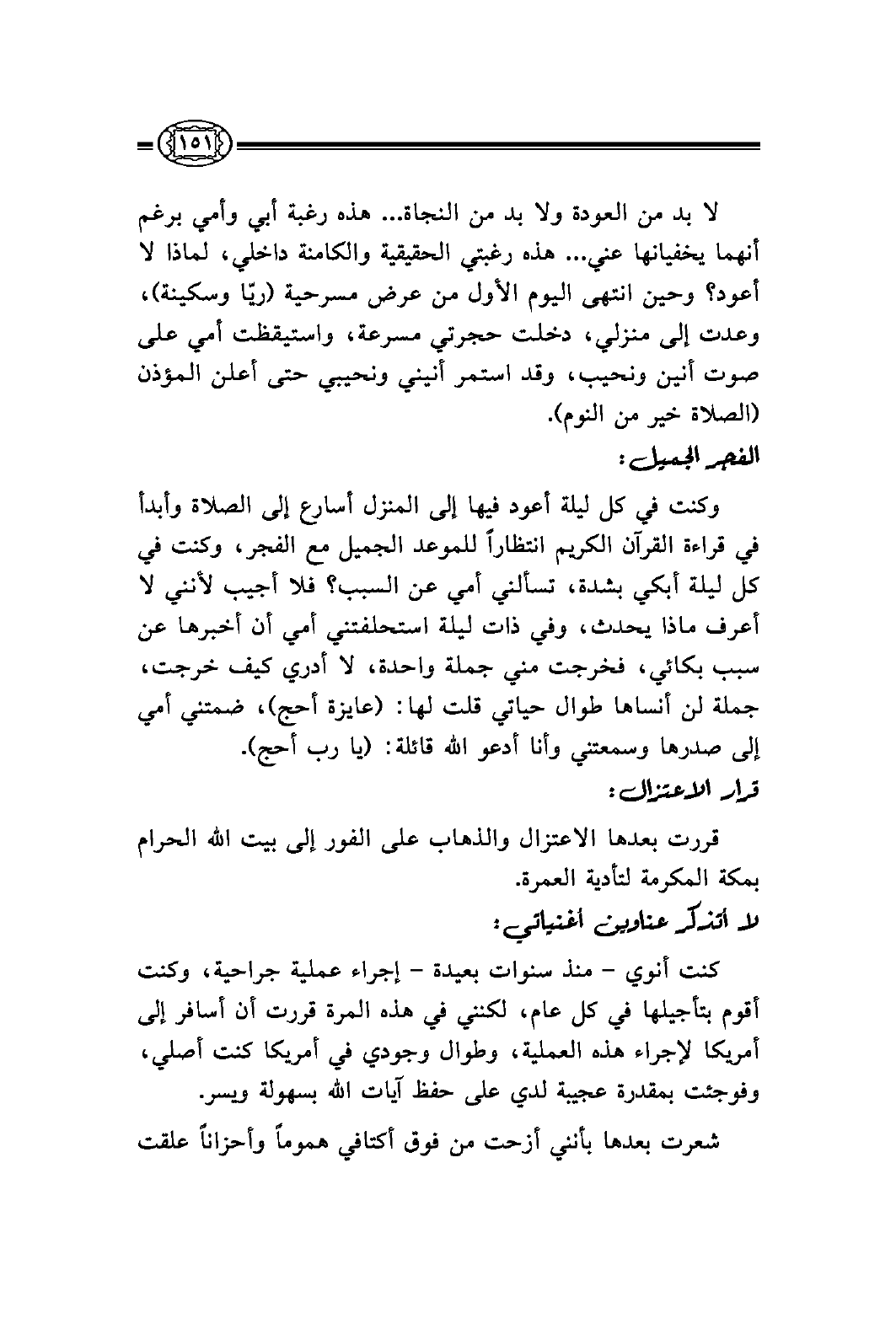 لا بد من العودة ولا بد من النجاة ... هذه رغبة أبي وأمي برغم أنهما يخفيانها عني ... هذه رغبتي الحقيقية والكامنة داخلي، لماذا لا أعود؟ وحين انتهى اليوم الأول من عرض مسرحية (ريّا وسكينة) ، وعدت إلى منزلي، دخلت حجرتي مسرعة، واستيقظت أمي على صوت أنين ونحيب، وقد استمر أنيني ونحيبي حتى أعلن المؤذن (الصلاة خير من النوم) .