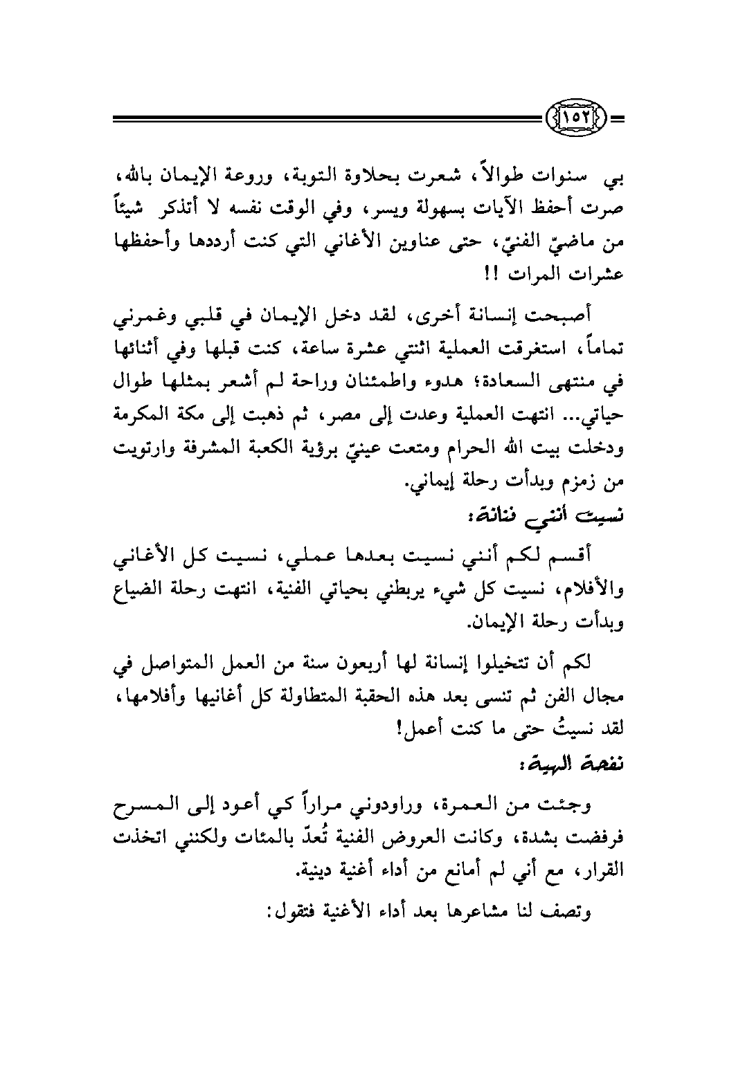 بي سنوات طوالاً، شعرت بحلاوة التوبة، وروعة الإيمان بالله، صرت أحفظ الآيات بسهولة ويسر، وفي الوقت نفسه لا أتذكر شيئاً من ماضيّ الفنيّ، حتى عناوين الأغاني التي كنت أرددها وأحفظها عشرات المرات!!