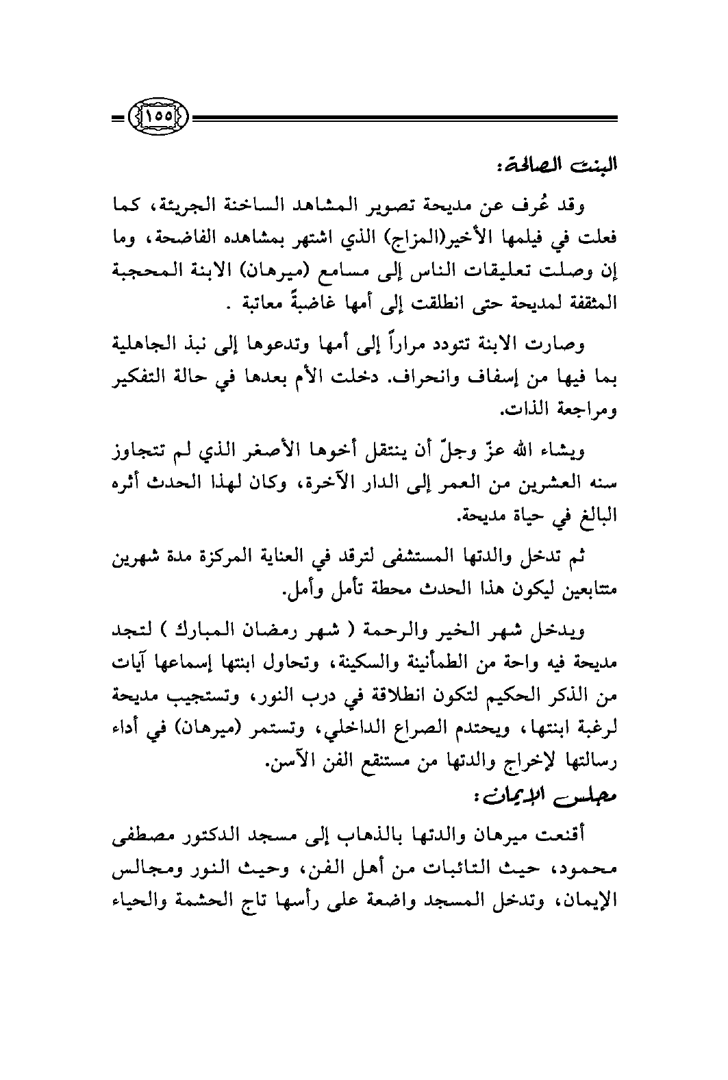 وصارت الابنة تتودد مراراً إلى أمها وتدعوها إلى نبذ الجاهلية بما فيها من إسفاف وانحراف. دخلت الأم بعدها في حالة التفكير ومراجعة الذات.