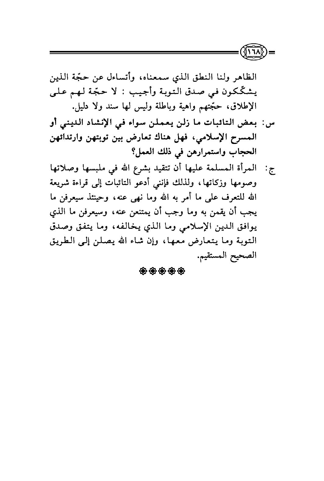 س: ... بعض التائبات ما زلن يعملن سواء في الإنشاد الديني أو المسرح الإسلامي، فهل هناك تعارض بين توبتهن وارتدائهن الحجاب واستمرارهن في ذلك العمل؟