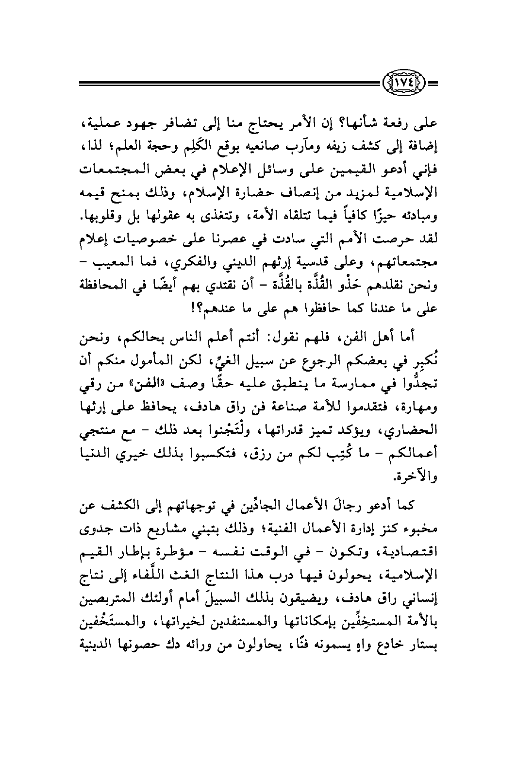 كما أدعو رجالَ الأعمال الجادِّين في توجهاتهم إلى الكشف عن مخبوء كنز إدارة الأعمال الفنية؛ وذلك بتبني مشاريع ذات جدوى اقتصادية، وتكون - في الوقت نفسه - مؤطرة بإطار القيم الإسلامية، يحولون فيها درب هذا النتاج الغث اللَّفاء إلى نتاج إنساني راق هادف، ويضيقون بذلك السبيلَ أمام أولئك المتربصين بالأمة المستخِفِّين بإمكاناتها والمستنفدين لخيراتها، والمستَخْفين بستار خادع واهٍ يسمونه فنًا، يحاولون من ورائه دك حصونها الدينية