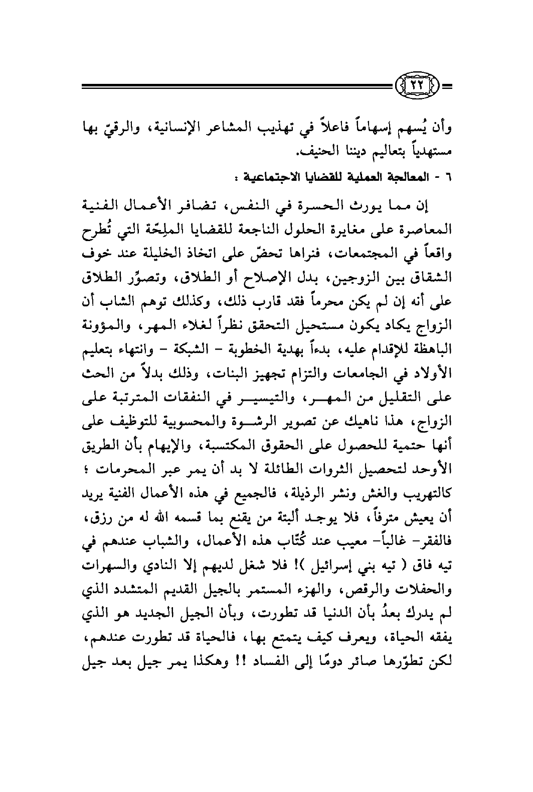 إن مما يورث الحسرة في النفس، تضافر الأعمال الفنية المعاصرة على مغايرة الحلول الناجعة للقضايا الملِحّة التي تُطرح واقعاً في المجتمعات، فنراها تحضّ على اتخاذ الخليلة عند خوف الشقاق بين الزوجين، بدل الإصلاح أو الطلاق، وتصوِّر الطلاق على أنه إن لم يكن محرماً فقد قارب ذلك، وكذلك توهم الشاب أن الزواج يكاد يكون مستحيل التحقق نظراً لغلاء المهر، والمؤونة الباهظة للإقدام عليه، بدءاً بهدية الخطوبة - الشبكة - وانتهاء بتعليم الأولاد في الجامعات والتزام تجهيز البنات، وذلك بدلاً من الحث على التقليل من المهر، والتيسير في النفقات المترتبة على الزواج، هذا ناهيك عن تصوير الرشوة والمحسوبية للتوظيف على أنها حتمية للحصول على الحقوق المكتسبة، والإيهام بأن الطريق الأوحد لتحصيل الثروات الطائلة لا بد أن يمر عبر المحرمات؛ كالتهريب والغش ونشر الرذيلة، فالجميع في هذه الأعمال الفنية يريد أن يعيش مترفاً، فلا يوجد ألبتة من يقنع بما قسمه الله له من رزق، فالفقر- غالباً- معيب عند كُتّاب هذه الأعمال، والشباب عندهم في تيه فاق (تيه بني إسرائيل) ! فلا شغل لديهم إلا النادي والسهرات والحفلات والرقص، والهزء المستمر بالجيل القديم المتشدد الذي لم يدرك بعدُ بأن الدنيا قد تطورت، وبأن الجيل الجديد هو الذي يفقه الحياة، ويعرف كيف يتمتع بها، فالحياة قد تطورت عندهم، لكن تطوّرها صائر دومًا إلى الفساد!! وهكذا يمر جيل بعد جيل