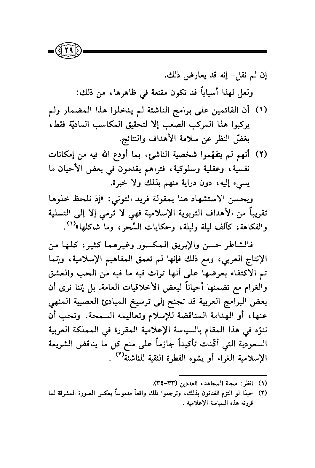 فالشاطر حسن والإبريق المكسور وغيرهما كثير، كلها من الإنتاج العربي، ومع ذلك فإنها لم تعمق المفاهيم الإسلامية، وإنما تم الاكتفاء بعرضها على أنها تراث فيه ما فيه من الحب والعشق والغرام مع تضمنها أحياناً لبعض الأخلاقيات العامة. بل إننا نرى أن بعض البرامج العربية قد تجنح إلى ترسيخ المبادئ العصبية المنهي عنها، أو الهدامة المناقضة للإسلام وتعاليمه السمحة. ونحب أن ننوّه في هذا المقام بالسياسة الإعلامية المقررة في المملكة العربية السعودية التي أكّدت تأكيداً جازماً على منع كل ما يناقض الشريعة الإسلامية الغراء أو يشوه الفطرة النقية للناشئة (¬2) .