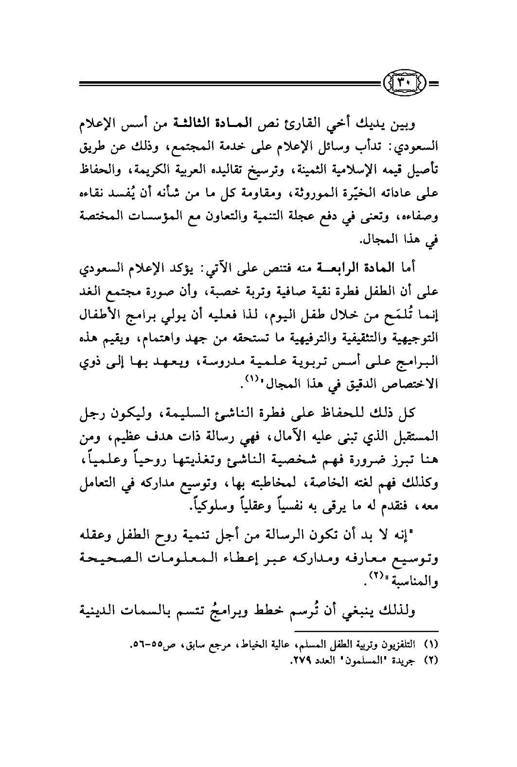 أما المادة الرابعة منه فتنص على الآتي: يؤكد الإعلام السعودي على أن الطفل فطرة نقية صافية وتربة خصبة، وأن صورة مجتمع الغد إنما تُلمَح من خلال طفل اليوم، لذا فعليه أن يولي برامج الأطفال التوجيهية والتثقيفية والترفيهية ما تستحقه من جهد واهتمام، ويقيم هذه البرامج على أسس تربوية علمية مدروسة، ويعهد بها إلى ذوي الاختصاص الدقيق في هذا المجال" (¬1) .