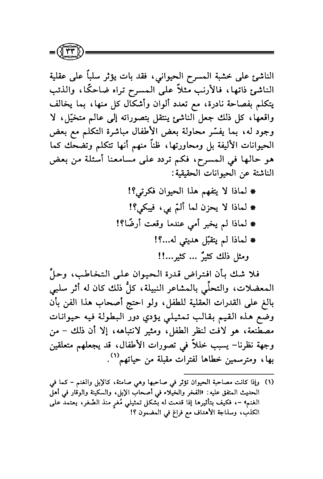 (¬1) وإذا كانت مصاحبة الحيوان تؤثر في صاحبها وهي صامتة، كالإبل والغنم - كما في الحديث المتفق عليه: «الفخر والخيلاء في أصحاب الإبل، والسكينة والوقار في أهل الغنم» -، فكيف بتأثيرها إذا قدمت له بشكل تمثيلي مُغرٍ منذ الصِّغر، يعتمد على الكذب، وسذاجة الأهداف مع فراغ في المضمون؟!