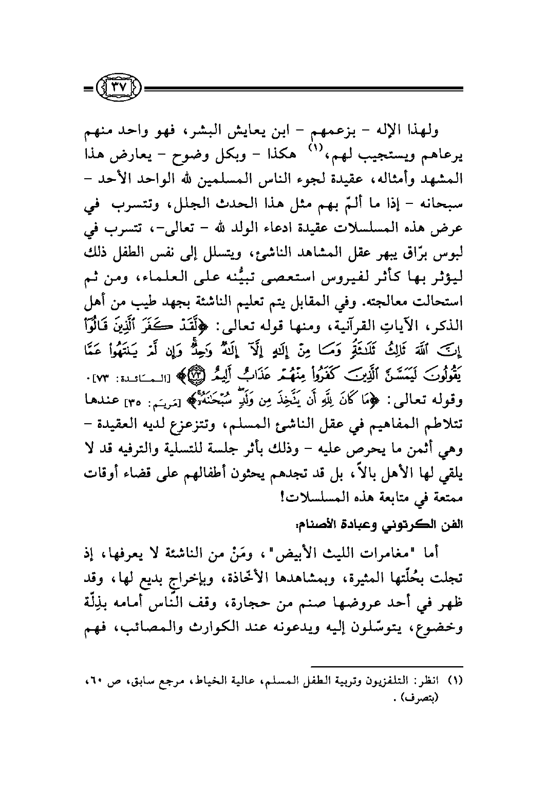 ولهذا الإله - بزعمهم - ابن يعايش البشر، فهو واحد منهم يرعاهم ويستجيب لهم، (¬1) هكذا - وبكل وضوح - يعارض هذا المشهد وأمثاله، عقيدة لجوء الناس المسلمين لله الواحد الأحد - سبحانه - إذا ما ألمّ بهم مثل هذا الحدث الجلل، وتتسرب في عرض هذه المسلسلات عقيدة ادعاء الولد لله - تعالى-، تتسرب في لبوس برّاق يبهر عقل المشاهد الناشئ، ويتسلل إلى نفس الطفل ذلك ليؤثر بها كأثر لفيروس استعصى تبيُّنه على العلماء، ومن ثم استحالت معالجته. وفي المقابل يتم تعليم الناشئة بجهد طيب من أهل الذكر، الآياتِ القرآنية، ومنها قوله تعالى: [المَائدة: 73] {مَا كَانَ لِلَّهِ أَنْ يَتَّخِذَ مِنْ وَلَدٍ سُبْحَانَهُ} عندها تتلاطم المفاهيم في عقل الناشئ المسلم، وتتزعزع لديه العقيدة - وهي أثمن ما يحرص عليه - وذلك بأثر جلسة للتسلية والترفيه قد لا يلقي لها الأهل بالاً، بل قد تجدهم يحثون أطفالهم على قضاء أوقات ممتعة في متابعة هذه المسلسلات!