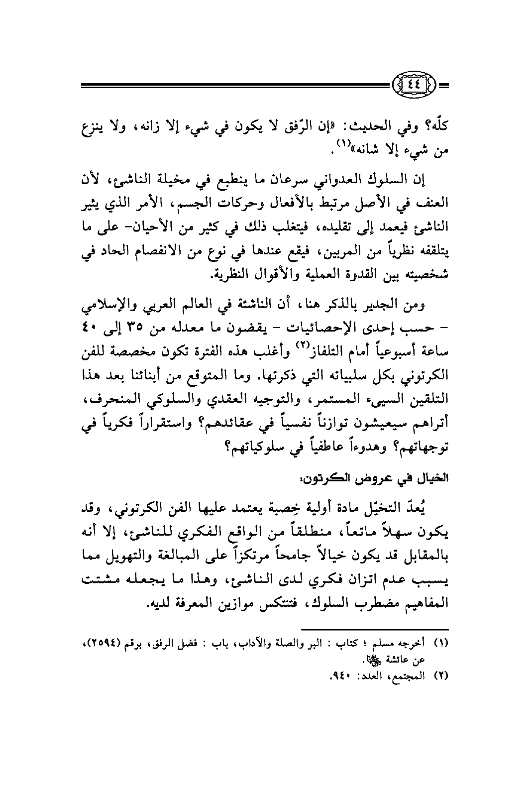 ومن الجدير بالذكر هنا، أن الناشئة في العالم العربي والإسلامي - حسب إحدى الإحصائيات - يقضون ما معدله من 35 إلى 40 ساعة أسبوعياً أمام التلفاز (¬2) وأغلب هذه الفترة تكون مخصصة للفن الكرتوني بكل سلبياته التي ذكرتها. وما المتوقع من أبنائنا بعد هذا التلقين السيىء المستمر، والتوجيه العقدي والسلوكي المنحرف، أتراهم سيعيشون توازناً نفسياً في عقائدهم؟ واستقراراً فكرياً في توجهاتهم؟ وهدوءاً عاطفياً في سلوكياتهم؟