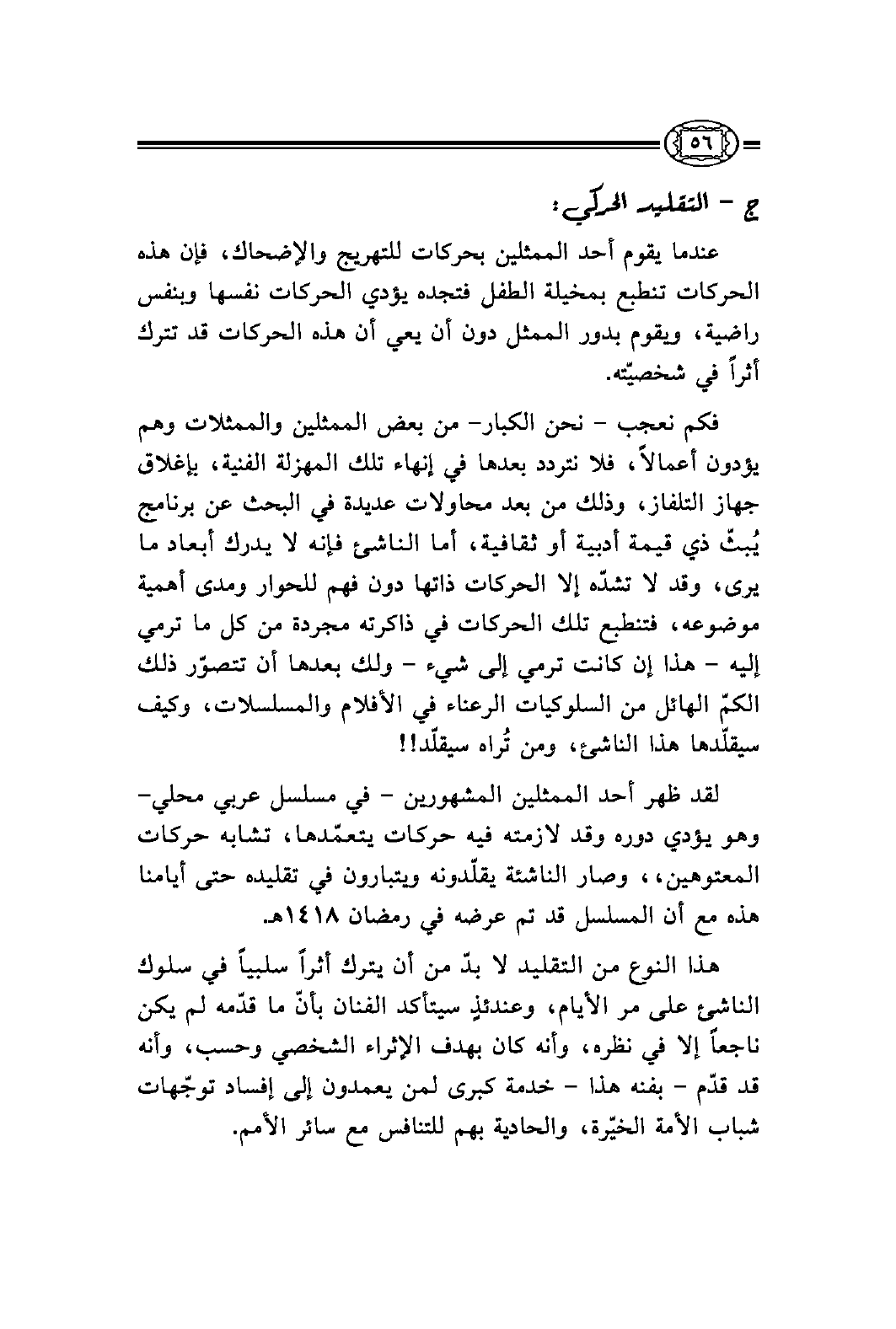لقد ظهر أحد الممثلين المشهورين - في مسلسل عربي محلي- وهو يؤدي دوره وقد لازمته فيه حركات يتعمّدها، تشابه حركات المعتوهين،، وصار الناشئة يقلّدونه ويتبارون في تقليده حتى أيامنا هذه مع أن المسلسل قد تم عرضه في رمضان 1418هـ.