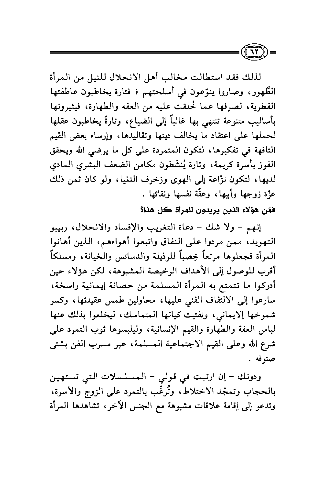 ودونك - إن ارتبت في قولي - المسلسلات التي تستهين بالحجاب وتمجّد الاختلاط، وتُرغّب بالتمرد على الزوج والأسرة، وتدعو إلى إقامة علاقات مشبوهة مع الجنس الآخر، تشاهدها المرأة