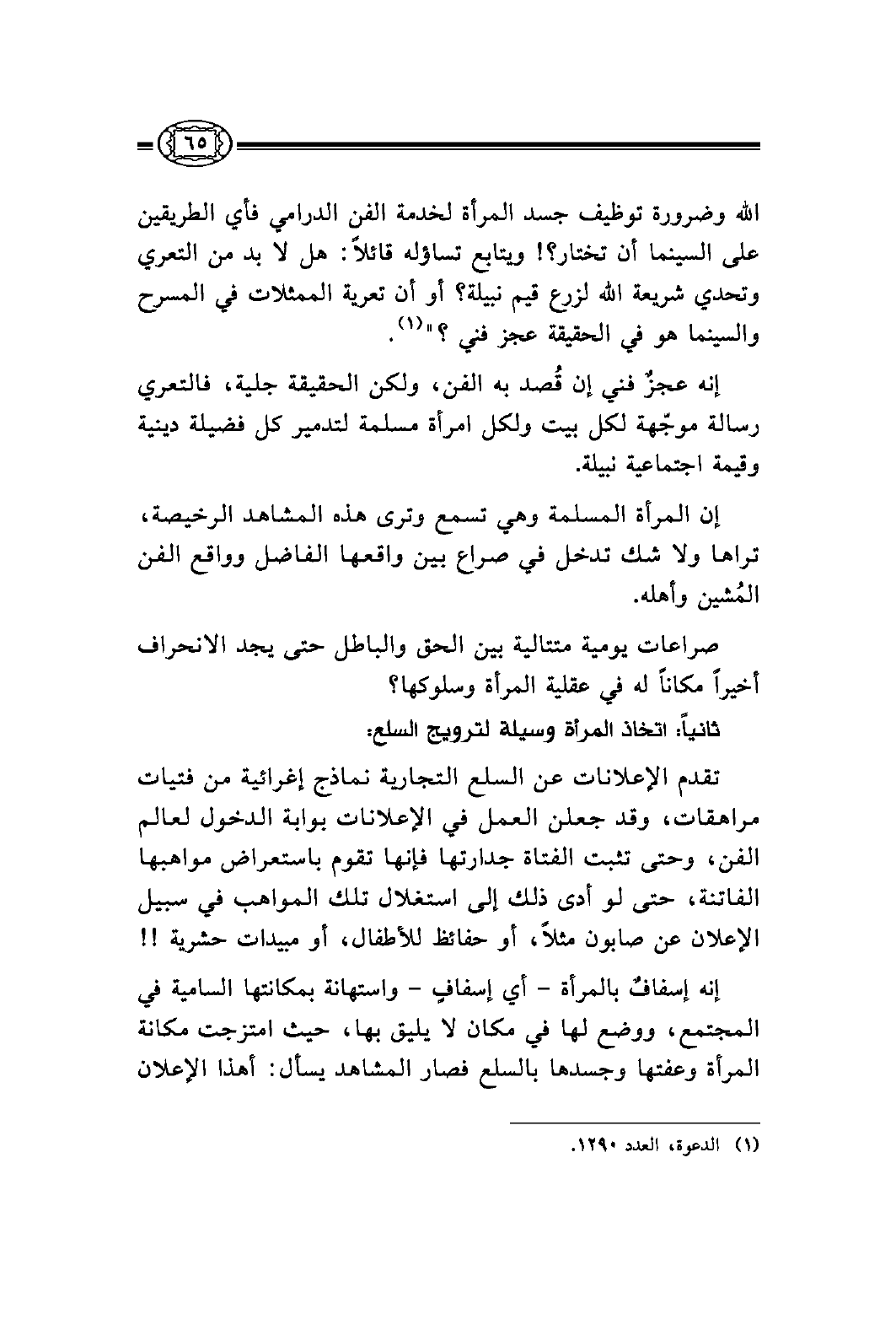 الله وضرورة توظيف جسد المرأة لخدمة الفن الدرامي فأي الطريقين على السينما أن تختار؟! ويتابع تساؤله قائلاً: هل لا بد من التعري وتحدي شريعة الله لزرع قيم نبيلة؟ أو أن تعرية الممثلات في المسرح والسينما هو في الحقيقة عجز فني؟ " (¬1) .