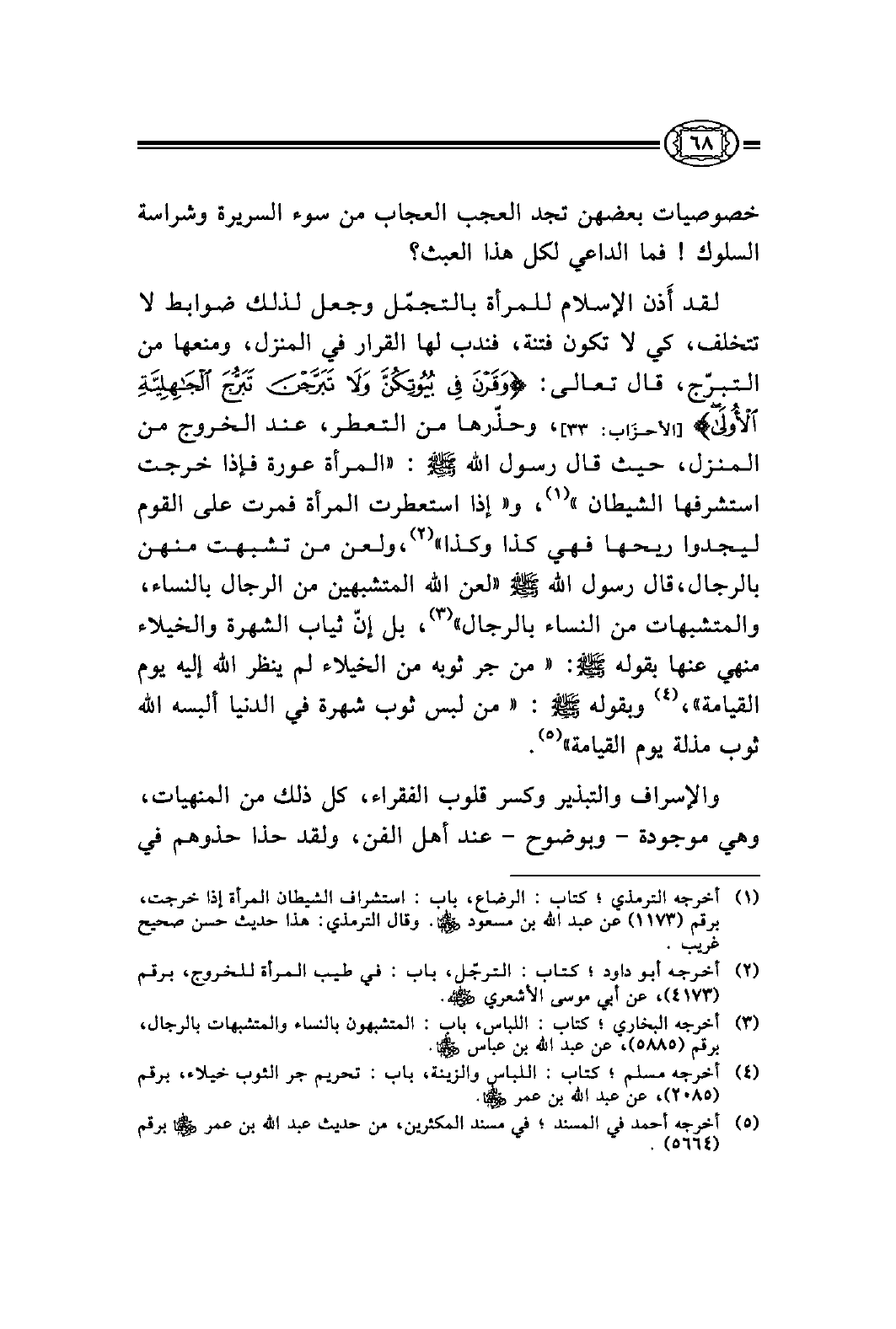 لقد أَذن الإسلام للمرأة بالتجمّل وجعل لذلك ضوابط لا تتخلف، كي لا تكون فتنة، فندب لها القرار في المنزل، ومنعها من التبرّج، قال تعالى: [الأحزَاب: 33] {وَقَرْنَ فِي بُيُوتِكُنَّ وَلاَ تَبَرَّجْنَ تَبَرُّجَ الْجَاهِلِيَّةِ الأُولَى} ، وحذّرها من التعطر، عند الخروج من المنزل، حيث قال رسول الله صلى الله عليه وسلم: «المرأة عورة فإذا خرجت استشرفها الشيطان» (¬1) ، و «إذا استعطرت المرأة فمرت على القوم ليجدوا ريحها فهي كذا وكذا» (¬2) ، ولعن من تشبهت منهن بالرجال، قال رسول الله صلى الله عليه وسلم «لعن الله المتشبهين من الرجال بالنساء، والمتشبهات من النساء بالرجال» (¬3) ، بل إنّ ثياب الشهرة والخيلاء منهي عنها بقوله صلى الله عليه وسلم: «من جر ثوبه من الخيلاء لم ينظر الله إليه يوم القيامة» ، (¬4) وبقوله صلى الله عليه وسلم: «من لبس ثوب شهرة في الدنيا ألبسه الله ثوب مذلة يوم القيامة» (¬5) .