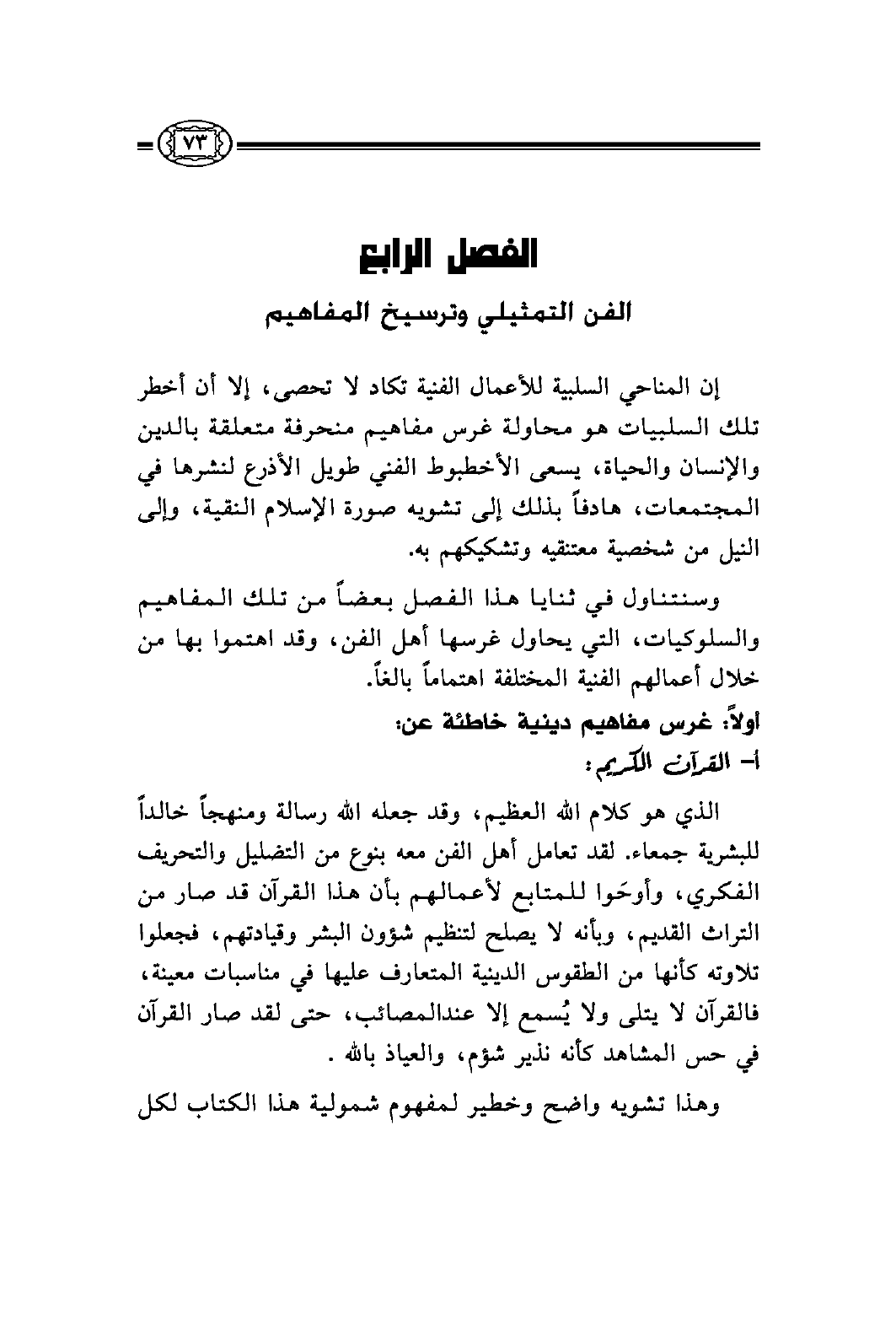 الذي هو كلام الله العظيم، وقد جعله الله رسالة ومنهجاً خالداً للبشرية جمعاء. لقد تعامل أهل الفن معه بنوع من التضليل والتحريف الفكري، وأوحَوا للمتابع لأعمالهم بأن هذا القرآن قد صار من التراث القديم، وبأنه لا يصلح لتنظيم شؤون البشر وقيادتهم، فجعلوا تلاوته كأنها من الطقوس الدينية المتعارف عليها في مناسبات معينة، فالقرآن لا يتلى ولا يُسمع إلا عندالمصائب، حتى لقد صار القرآن في حس المشاهد كأنه نذير شؤم، والعياذ بالله.