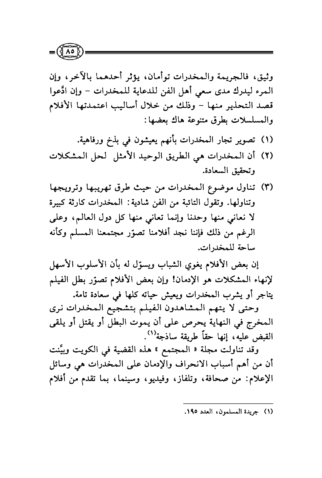 وقد تناولت مجلة «المجتمع» هذه القضية في الكويت وبيَّّنت أن من أهم أسباب الانحراف والإدمان على المخدرات هي وسائل الإعلام: من صحافة، وتلفاز، وفيديو، وسينما، بما تقدم من أفلام