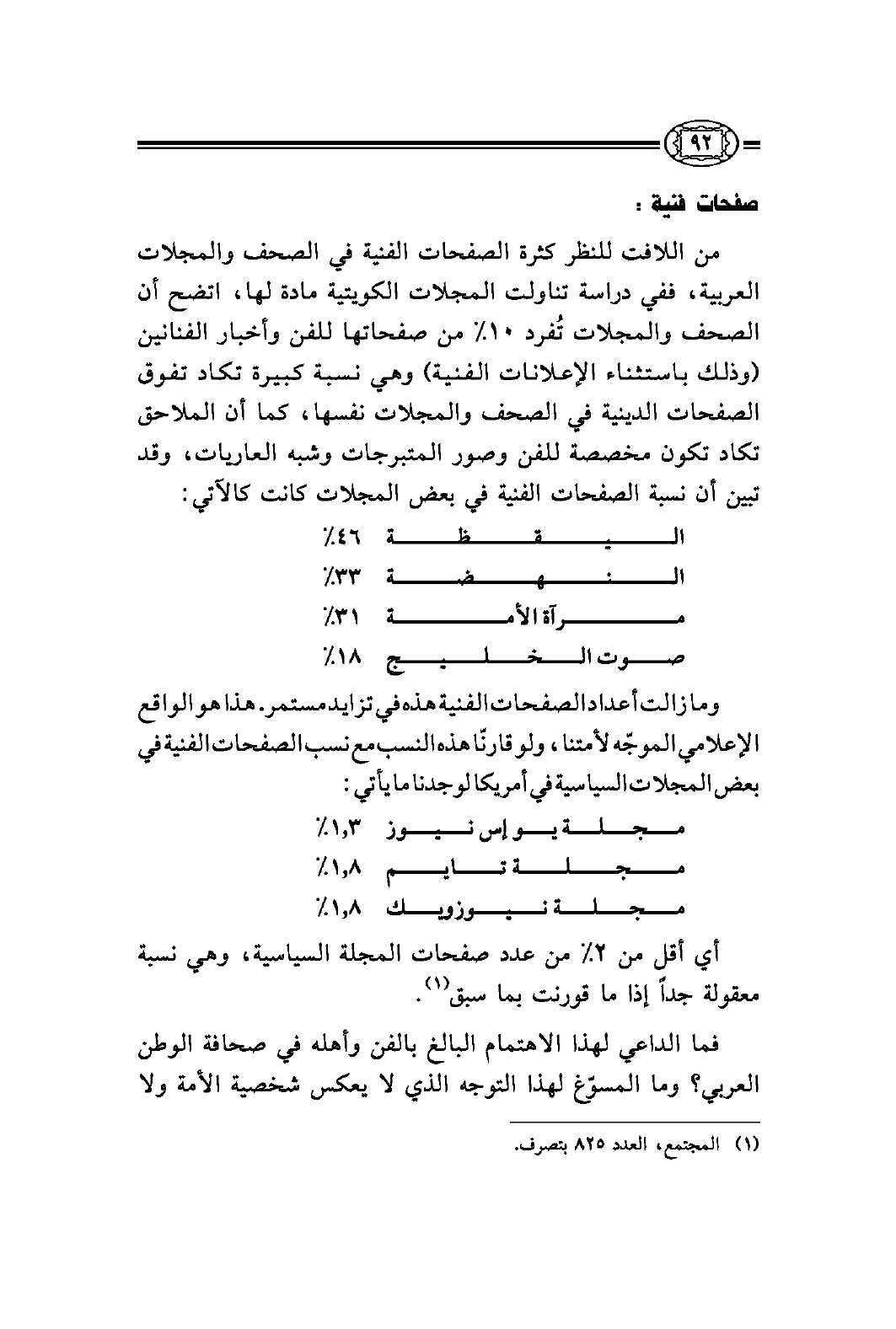 من اللافت للنظر كثرة الصفحات الفنية في الصحف والمجلات العربية، ففي دراسة تناولت المجلات الكويتية مادة لها، اتضح أن الصحف والمجلات تُفرد 10% من صفحاتها للفن وأخبار الفنانين (وذلك باستثناء الإعلانات الفنية) وهي نسبة كبيرة تكاد تفوق الصفحات الدينية في الصحف والمجلات نفسها، كما أن الملاحق تكاد تكون مخصصة للفن وصور المتبرجات وشبه العاريات، وقد تبين أن نسبة الصفحات الفنية في بعض المجلات كانت كالآتي: