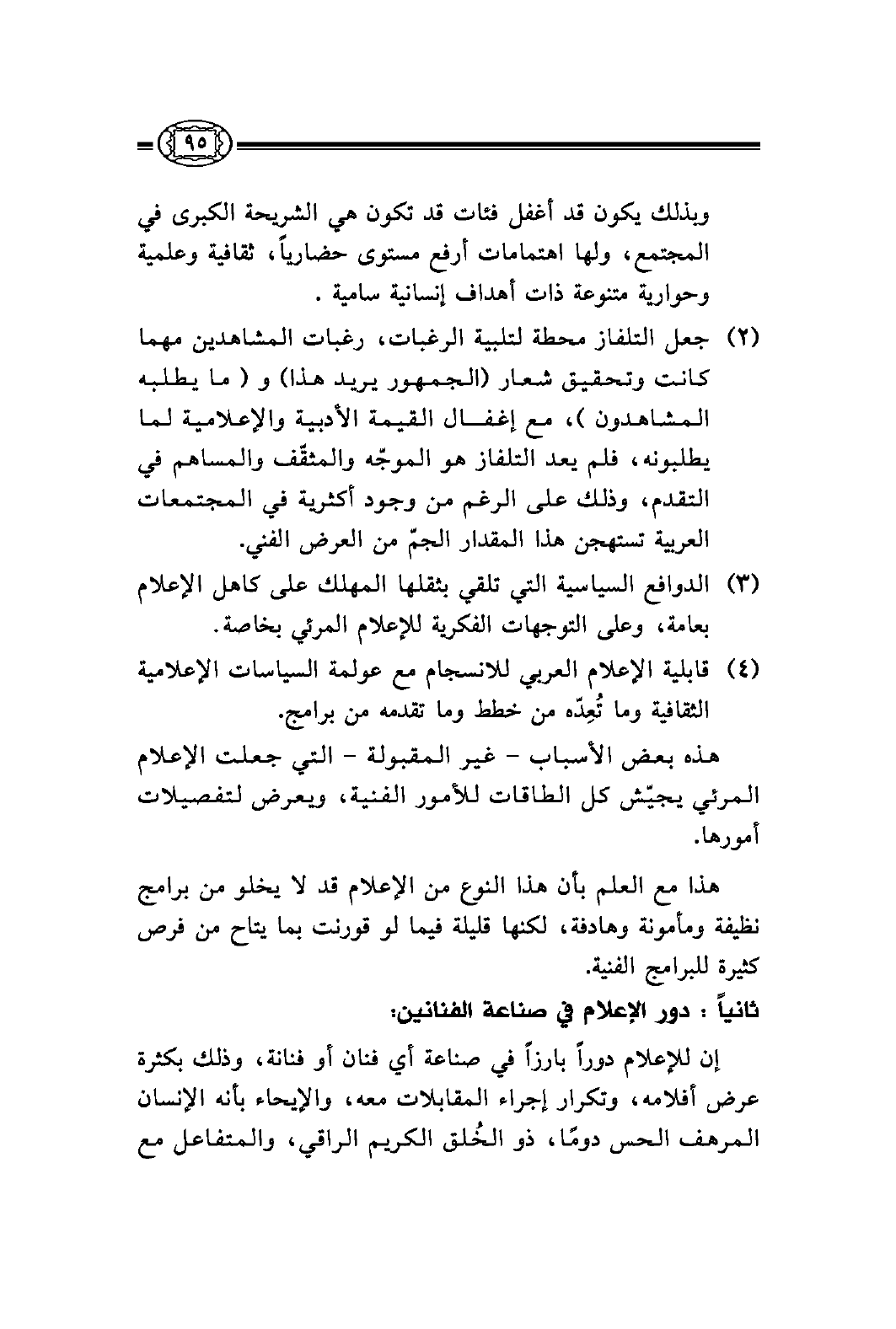 هذا مع العلم بأن هذا النوع من الإعلام قد لا يخلو من برامج نظيفة ومأمونة وهادفة، لكنها قليلة فيما لو قورنت بما يتاح من فرص كثيرة للبرامج الفنية.