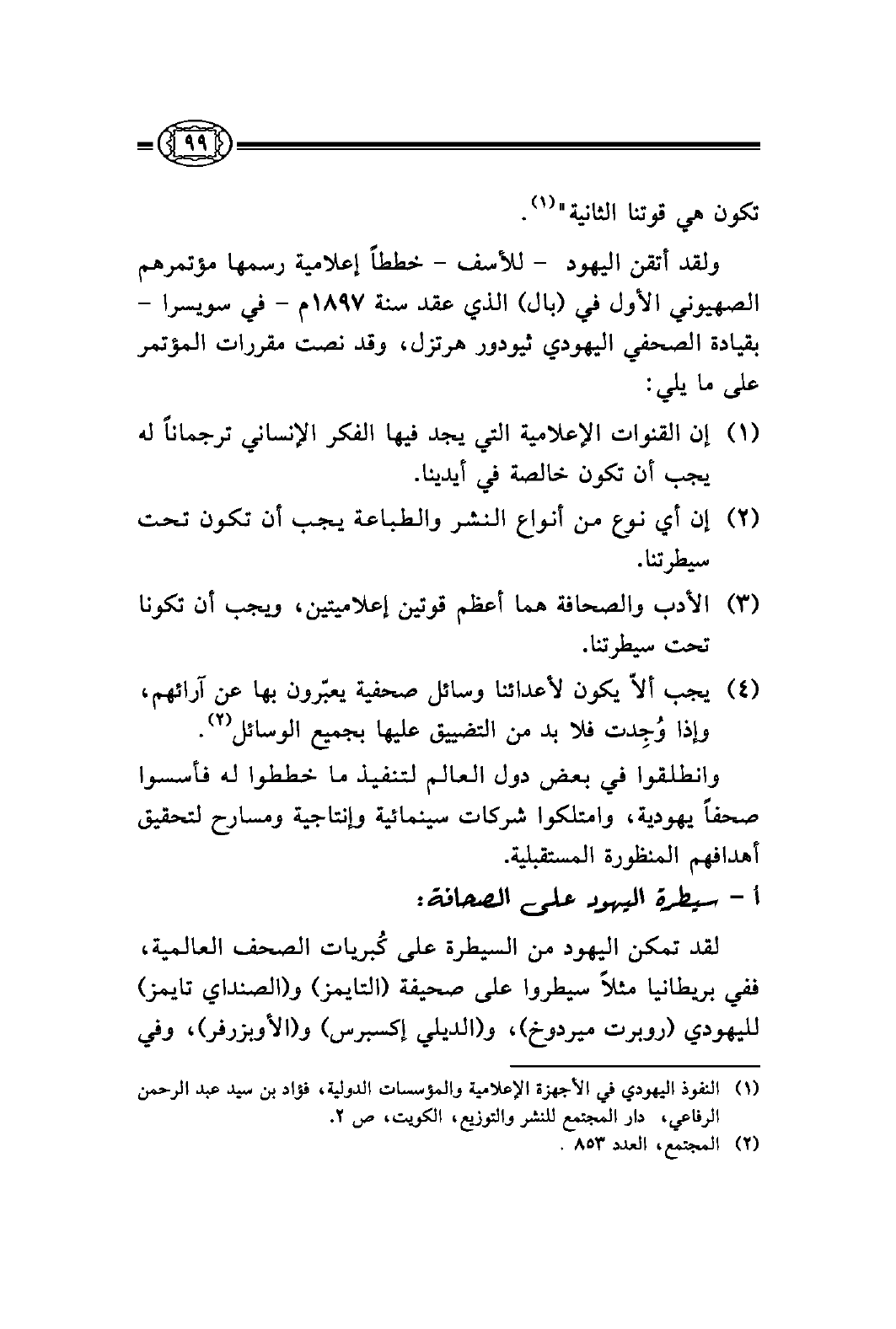 (¬1) النفوذ اليهودي في الأجهزة الإعلامية والمؤسسات الدولية، فؤاد بن سيد عبد الرحمن الرفاعي، دار المجتمع للنشر والتوزيع، الكويت، ص 2.