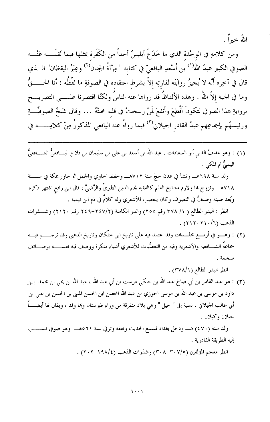 ومن كلامه في الوحدة الذي ما خدع إبليس أحدا من الكفرة. ممثلها فيما نقله عنه الصوفي الكبير عبد الله (¬1) بن أسعد اليافعي في كتابه " مرآة الجنان (¬2) وعبر اليقظان " الذي قال في أخره أنه لا يجيز روايته لقارئه إلا بشرط اعتقاده في الصوفة ما لفظه: أنا الحق وما في الجبة إلا الله. وهذه الألفاظ قد رواها عنه الناس ولكنا اقتصرنا على التصريح برواية هذا الصوفي لتكون أقطع وأنفع لمن رسخت في قلبه محبته ... وقال شيخ الصوفية ورئيسهم بإجماعهم عبد القادر الجيلاني (¬3) فيما رواه عنه اليافعي المذكور من كلامه في