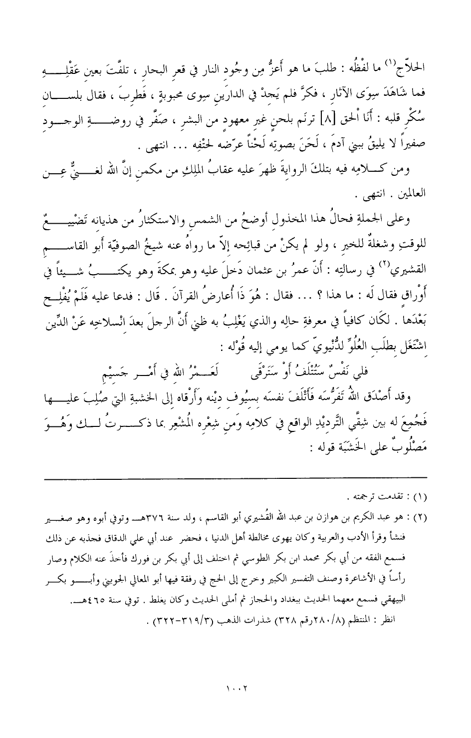 (¬2) هو عبد الكريم بن هوازن بن عبد الله القشيري أبو القاسم، ولد سنة 376 هـ وتوفي أبوه وهو صغير فنشأ وقرأ الأدب والعربية وكان يهوى مخالطة أهل الدنيا، فحضر عند أبي علي الدقاق فجذبه عن ذلك فسمع الفقه من أبي بكر محمد ابن بكر الطوسي ثم اختلف إلى أبي بكر بن فورك فأخذ عنه الكلام وصار رأسا في الأشاعرة وصنف التفسير الكبير وخرج إلى الحج في رفقة فيها أبو المعالي الجويني وأبو بكر البيهقي فسمع معهما الحديث ببغداد والحجاز ثم أملى الحديث وكان يغلط. توفي سنة 465 هـ.