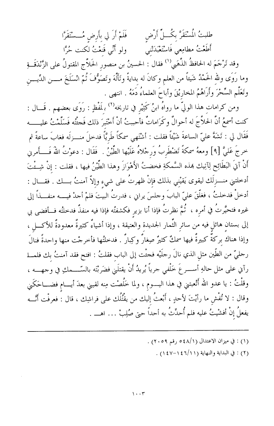 ومن كرامات هذا الولي ما رواه ابن. كثير في تاريخه (¬2) بلفظ: روى بعضهم. قال: كنت أسمع أن الحلاج له أحوال وكرامات فأحببت أن أختبر ذلك فجئته فسلمت عليه فقال لي: تشه علي الساعة شيئا فقلت: أشتهى سمكا طريا فدخل منزله فغاب ساعة ثم خرج علي [9] ومعه سمكة تضطرب ورجلاه عليها الطين. فقال: دعوت الله فأمرني أن آتي البطائح لآتيك هذه السمكة فخضت الأهواز وهذا الطين فيها، فقلت: إن شئت أدخلتني منزلك ليقوى يقيني بذلك فإن ظهرت على شيء وإلا آمنت بك. فقال: أدخل فدخلت، فغلق على الباب وجلس يراني، فدرت البيت فلم أجد فيه منفذا إلى غيره فتحيرت في أمره، ثم نظرت فإذا أنا بزير فكشفته فإذا فيه منفذ فدخلته فأفضى بي إلى بستان هائل فيه من سائر الثمار الجديدة والعتيقة، وإذا أشياء كثيرة معدودة للأكل، وإذا هناك بركة كبيرة فيها سمك كثير صغار وكبار. فدخلتها فأخرجت منها واحدة فنال رجل من الطين مثل الذي نال رجليه فجئت إلى الباب فقلت: افتح فقد آمنت بك فلما رآني على مثل حاله أسرع خلفي جريا يريد أن يقتلني فضربته بالسمك في وجهه، وقلت: يا عدو الله أتعبتني في هذا اليوم، ولما خلصت منه لقيني بعد أيام فضاحكني وقال: لا تفش ما رأيت لأحد، أبعث إليك من يقتلك على فراشك، قال: فعرفت أنه يفعل إن أفشيت عليه فلم أحدث به أحدا حتى صلب ... ا هـ.