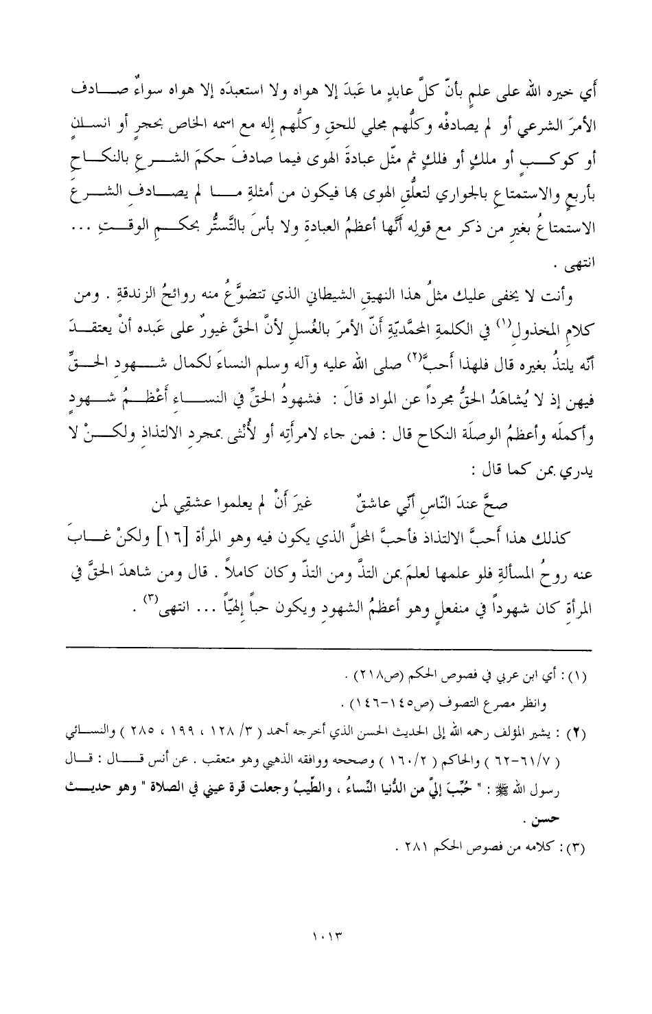 (¬2) يشير المؤلف رحمه الله إلى الحديث الحسن الذي أخرجه أحمد (3/ 128، 199، 285) والنسائي (7/ 61 - 62) والحاكم (2/ 160) وصححه ووافقه الذهبي وهو متعقب. عن أنس قال: قال رسول الله صَلَّى اللهُ عَلَيْهِ وَسَلَّمَ: " حبب إلي من الدنيا النساء، والطيب وجعلت قرة عيني في الصلاة" وهو حديث حسن.