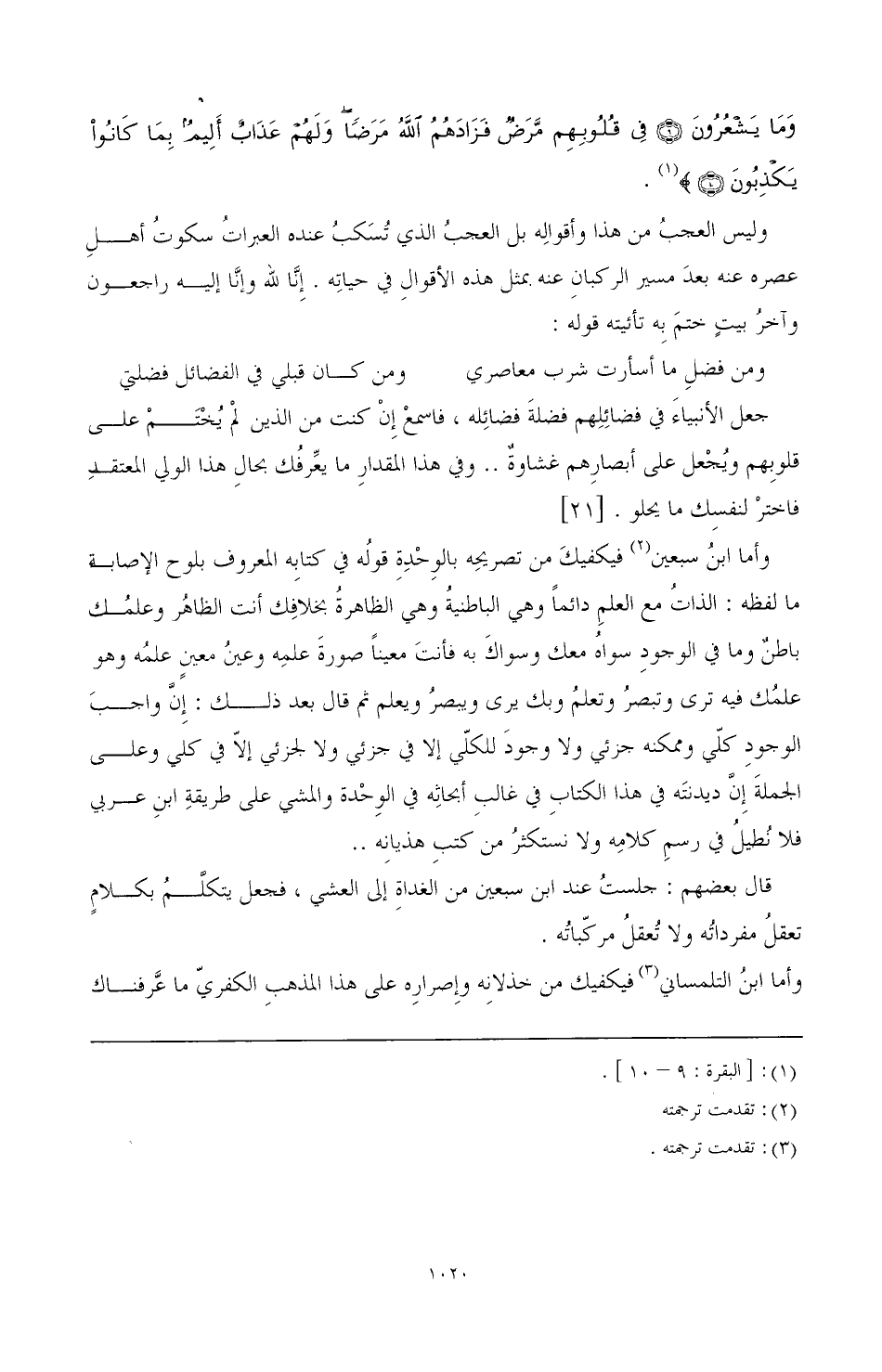 وأما ابن سبعين (¬1) فيكفيك من تصريحه بالوحدة قوله في كتابه المعروف بلوح الإصابة ما لفظه: الذات مع العلم دائما وهى الباطنية وهي الظاهرة بخلافك أنت الظاهر وعلمك باطن وما في الوجود سواه معك وسواك به فأنت معينا صورة علمه وعن معين علمه وهو علمك فيه ترى وتبصر وتعلم وبك يرى ويبصر ويعلم ثم قال بعد ذلك: إن واجب الوجود كلي وممكنه جزئي ولا وجود للكلي إلا في جزئي ولا لجزئي إلا في كلي وعلى الجملة إن ديدنته في هذا الكتاب في غالب أبحاثه في الوحدة والمشط على طريقة ابن عربي فلا نطيل في رسم كلامه ولا نستكثر من كتب هذيانه ..