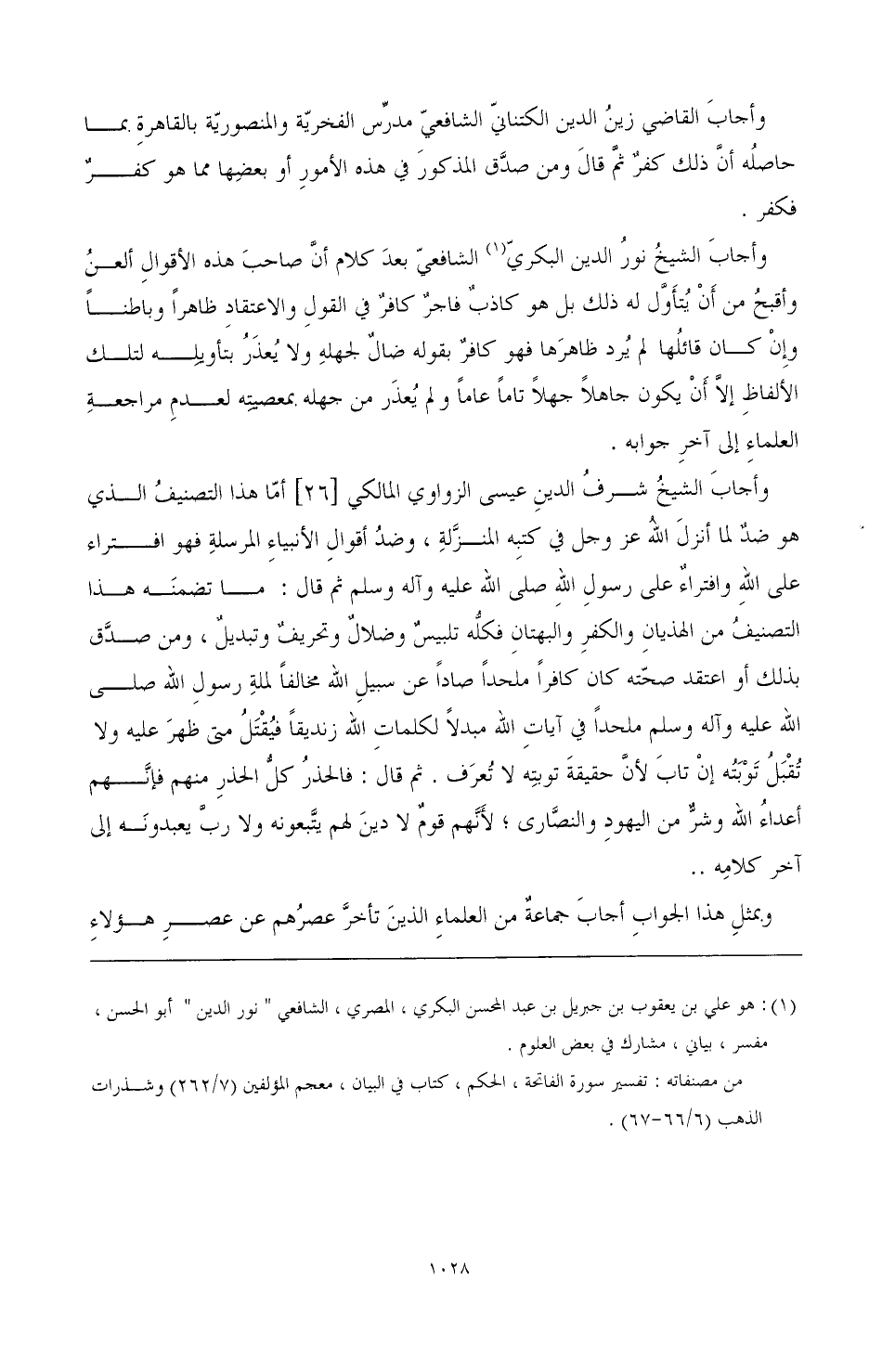 وأجاب القاضي زين الدين الكتناني الشافعي مدرس الفخرية والمنصورية بالقاهرة. مما حاصله أن ذلك كفر ثم قال ومن صدق المذكور في هذه الأمور أو بعضها مما هو كفر فكفر.